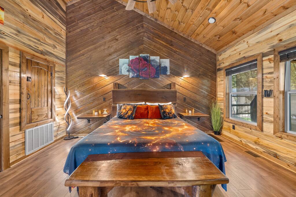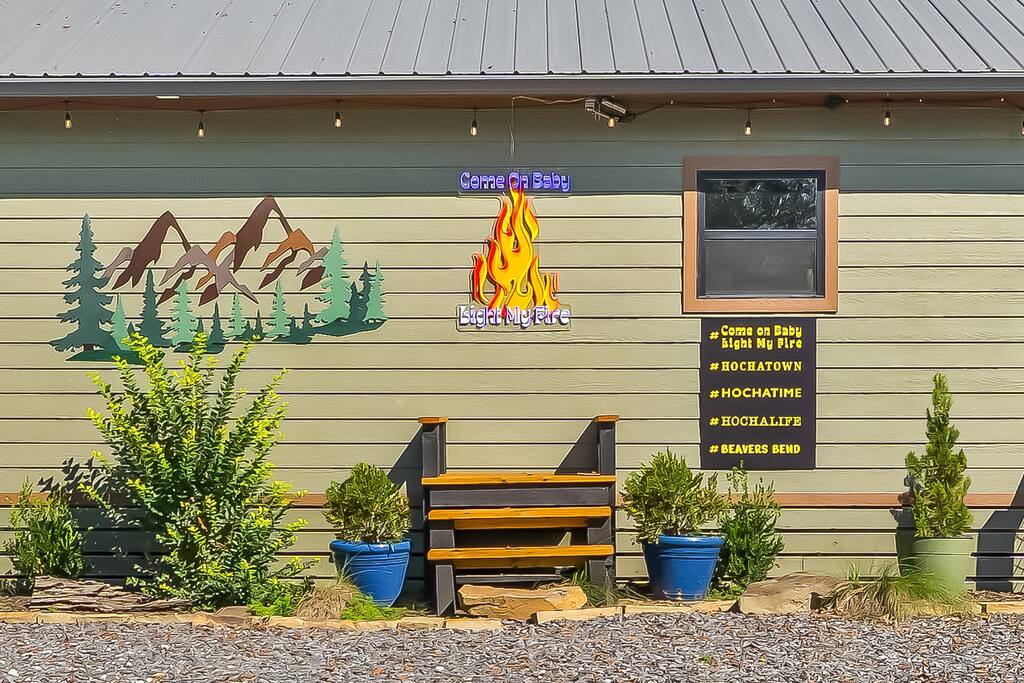 Escape to COME ON BABY LIGHT MY FIRE, a cozy one-bedroom cabin on the edge of the old Camp Family Ranch in Hochatown, OK. Enjoy cathedral ceilings, a double-sided fireplace, copper vanities, and a private hot tub. Relax on the covered deck, cozy up or stargaze by the fire pit. Three minutes from Choctaw Landing Casino and Grateful Head Pizza Oven & Tap Room, this charming retreat blends rustic elegance with modern comfort. It's perfect for couples or honeymooners seeking a romantic getaway.