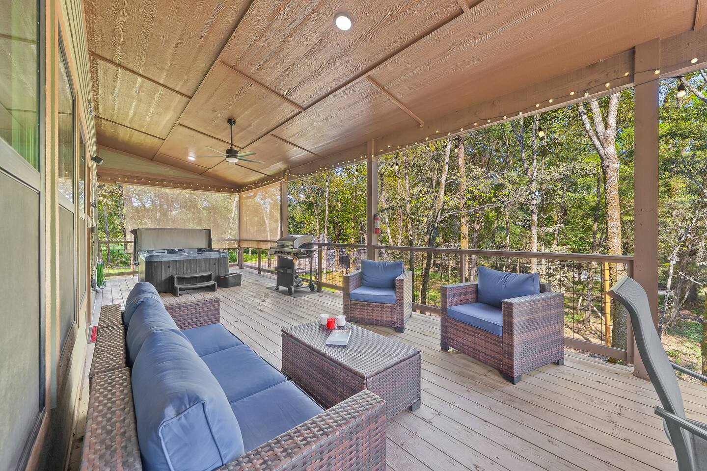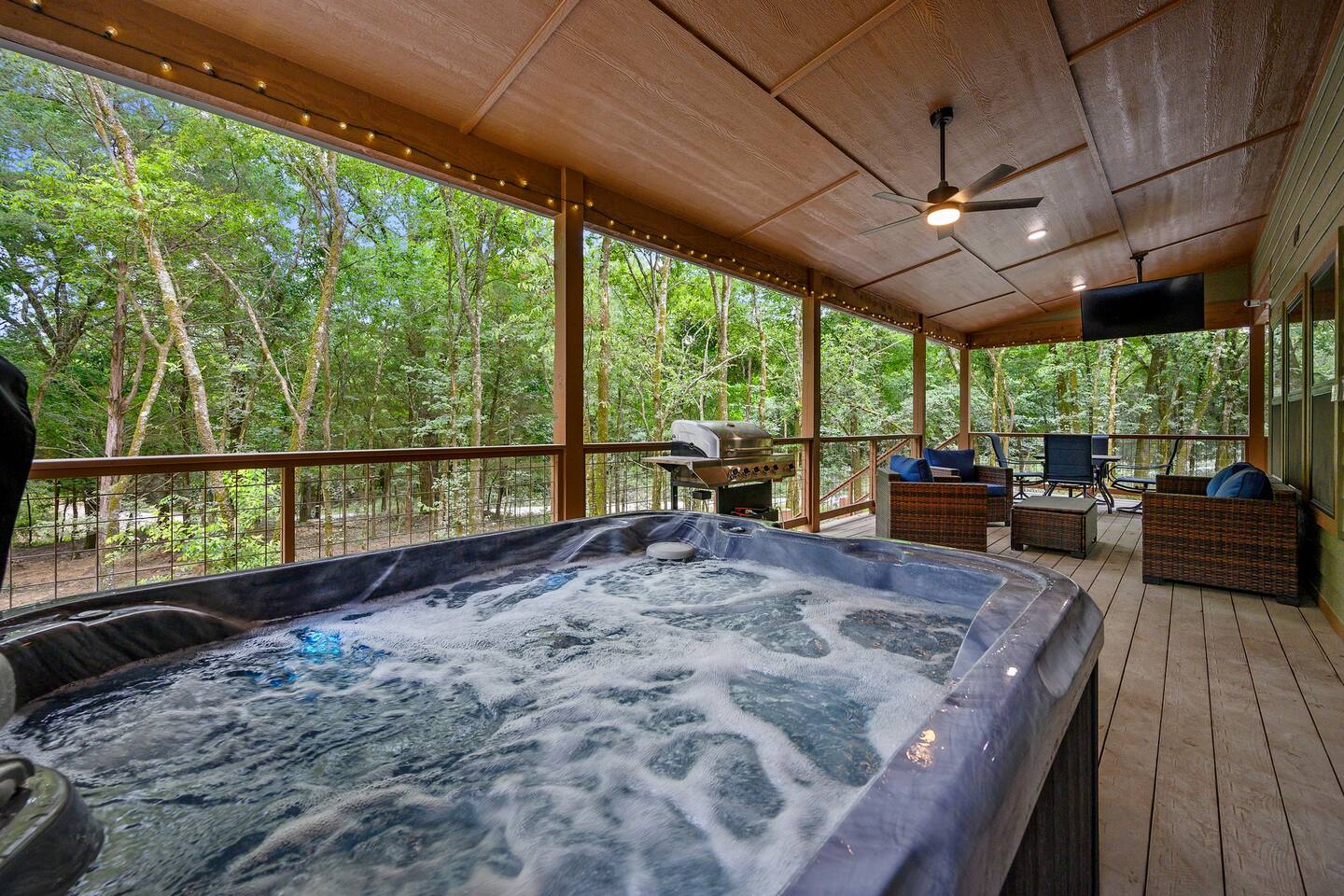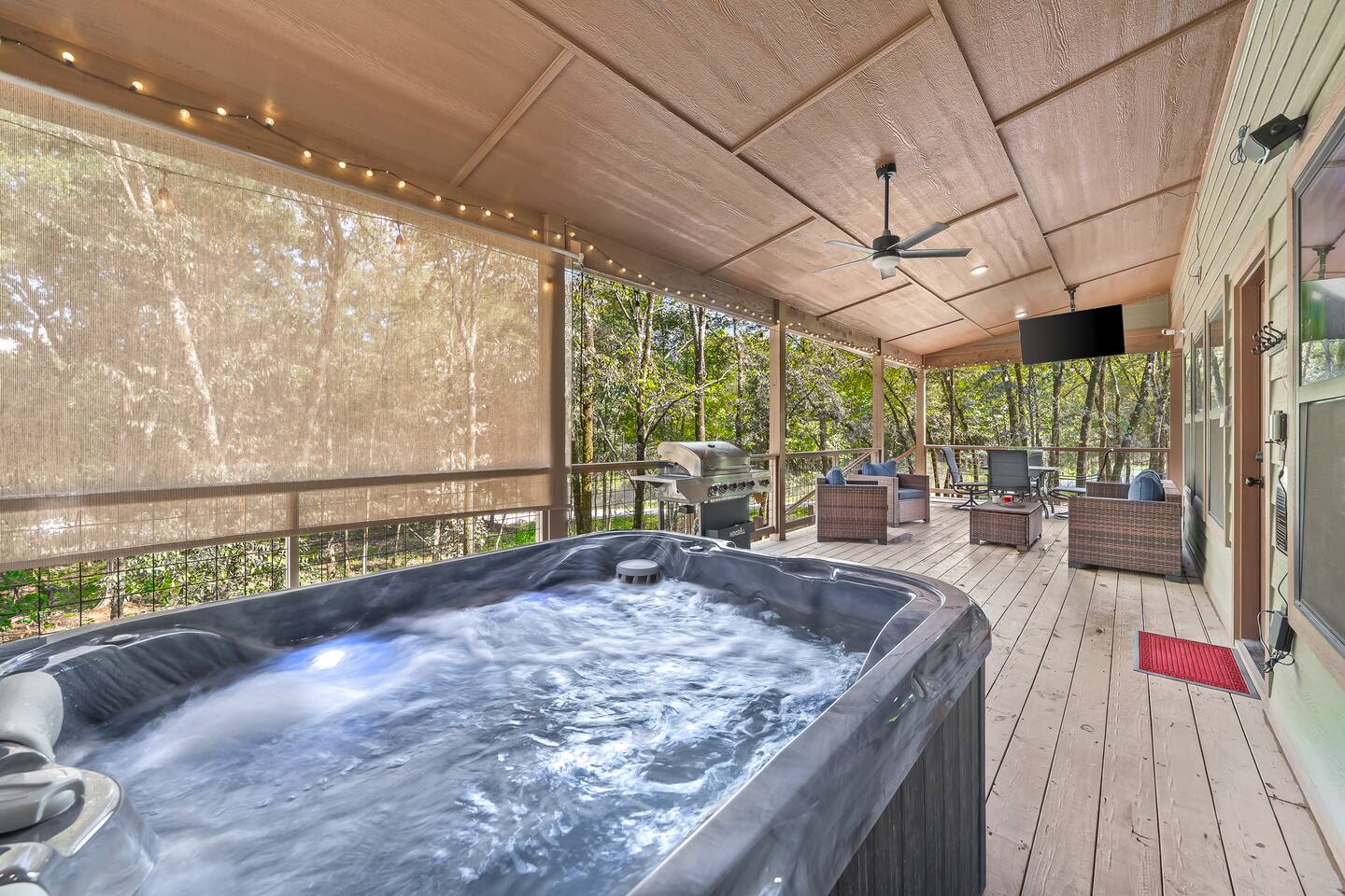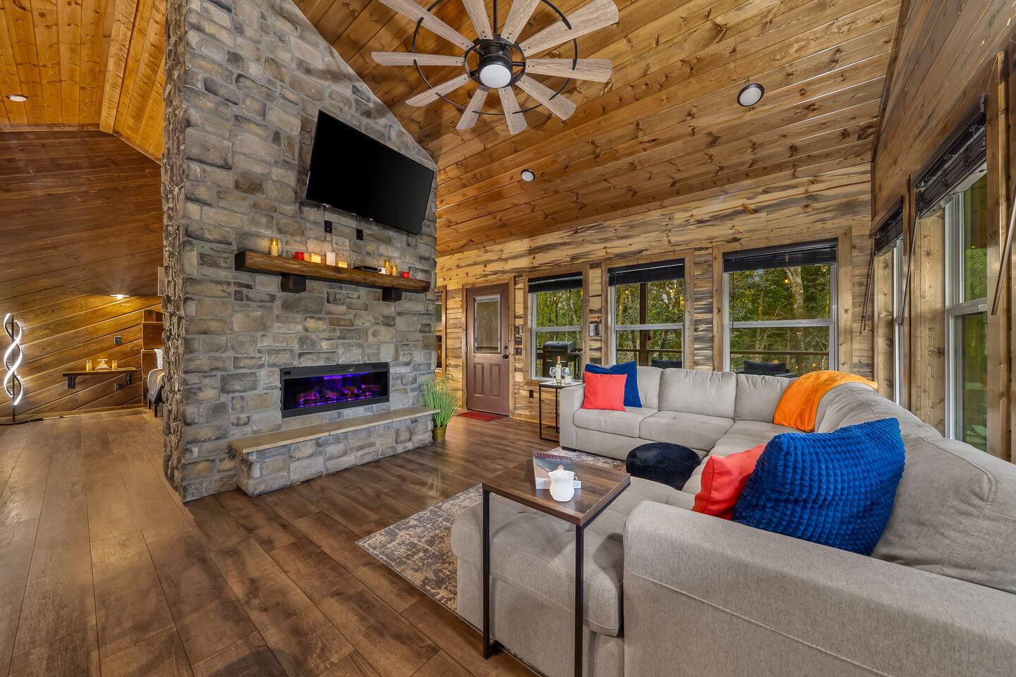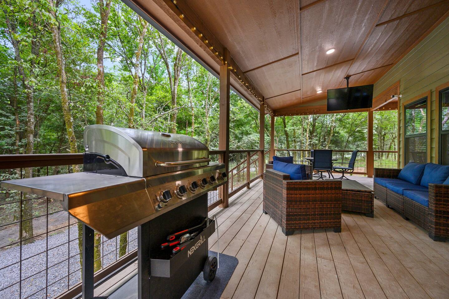 ⭑Primary Bedroom: Come On Baby Light My Fire⭑ ✔ Spacious and romantic ambiance, perfect for couples ✔ Luxurious bed linens, extra pillows, and blankets for ultimate comfort ✔ Clothing storage and hangers ✔ 65" Smart TV above the mantle ⭑Living Room:⭑ ✔ Cozy living space with a 65" Smart TV for your streaming pleasure ✔ Vent-free propane gas indoor fireplace for a warm, intimate setting ✔ 65" Smart TV above the mantle ⭑Kitchen & Dining Area:⭑ ✔ Fully equipped kitchen with stainless steel appliances: LP propane gas 5-burner cooktop range, fridge, microwave, and dishwasher (dishwasher pods provided) ✔ Cooking basics, dinnerware, and silverware included ✔ Keurig/coffee machine combo and wine glasses for a relaxing experience ✔ Grill accessories, utensils, and marshmallow/hot dog skewers located in kitchen drawer ⭑Bathrooms:⭑ ✔ Hotel-quality towels & linens, toilet paper, hand soap, and a starter kit of body wash, shampoo & conditioner ✔ Private toilet area ✔ Spacious walk-in shower with bench seat Laundry: ✔ Full-size stackable washer/dryer (washing pods provided) ⭑Outdoor Space:⭑ ✔ Private area with a fire pit ✔ Year-round hot tub spa for a soothing experience ✔ Outdoor hard piped BBQ grill (no need to bring propane) ✔Outdoor dining table with four chairs on the back porch ✔Outdoor patio set with sofa, 2 side chairs, and a coffee table ✔55" Smart TV on the porch ⭑Safety & Security:⭑ ✔ Exterior security cameras for peace of mind (no cameras face the hot tub) ✔ Smoke alarm, carbon monoxide alarm, and first aid kit provided ✔ Fire extinguishers located in the kitchen left of the sink and on patio right of grill ⭑Entertainment & Connectivity:⭑ ✔ High-speed Wi-Fi and dedicated workspace ✔ 3 Smart TVs ⭑Heating & Cooling:⭑ ✔ Central air conditioning and heating ✔ Ceiling fans for added comfort ⭑Parking & Accessibility:⭑ ✔ Free driveway parking for up to 4 vehicles ✔ Single-level home with no stairs — easy accessibility ✔ Several steps to the porch ✔ Boat parking available ⭑Services and Experiences⭑ ✔ NEW: Add-on services available - From a romantic dinner prepared by a private chef to a local in-cabin massage therapy ✔ Short distance from trails, wineries, and Hochatown's new Airbnb Experiences ✔ Schlage Encode Keypad Self check-in for convenience Your stay at Come On Baby Light My Fire promises unforgettable comfort, modern convenience, and an atmosphere designed to spark connection. This luxurious creek-side escape is sure to be one of our most popular retreats. Book now and let the flames of romance and cherished memories run wild at Come On Baby Light My Fire. Booking with Tree Frog Getaways means securing more than just a place to stay. You’re choosing a five-star experience managed by one of the top-performing management teams in the industry. Some of our cabins rank among the top 5% on Airbnb. All of our cabins are ranked among guest favorites that are celebrated for their thoughtful details, premium amenities, and spotless presentation. Availability is limited, so reserve your dates today.