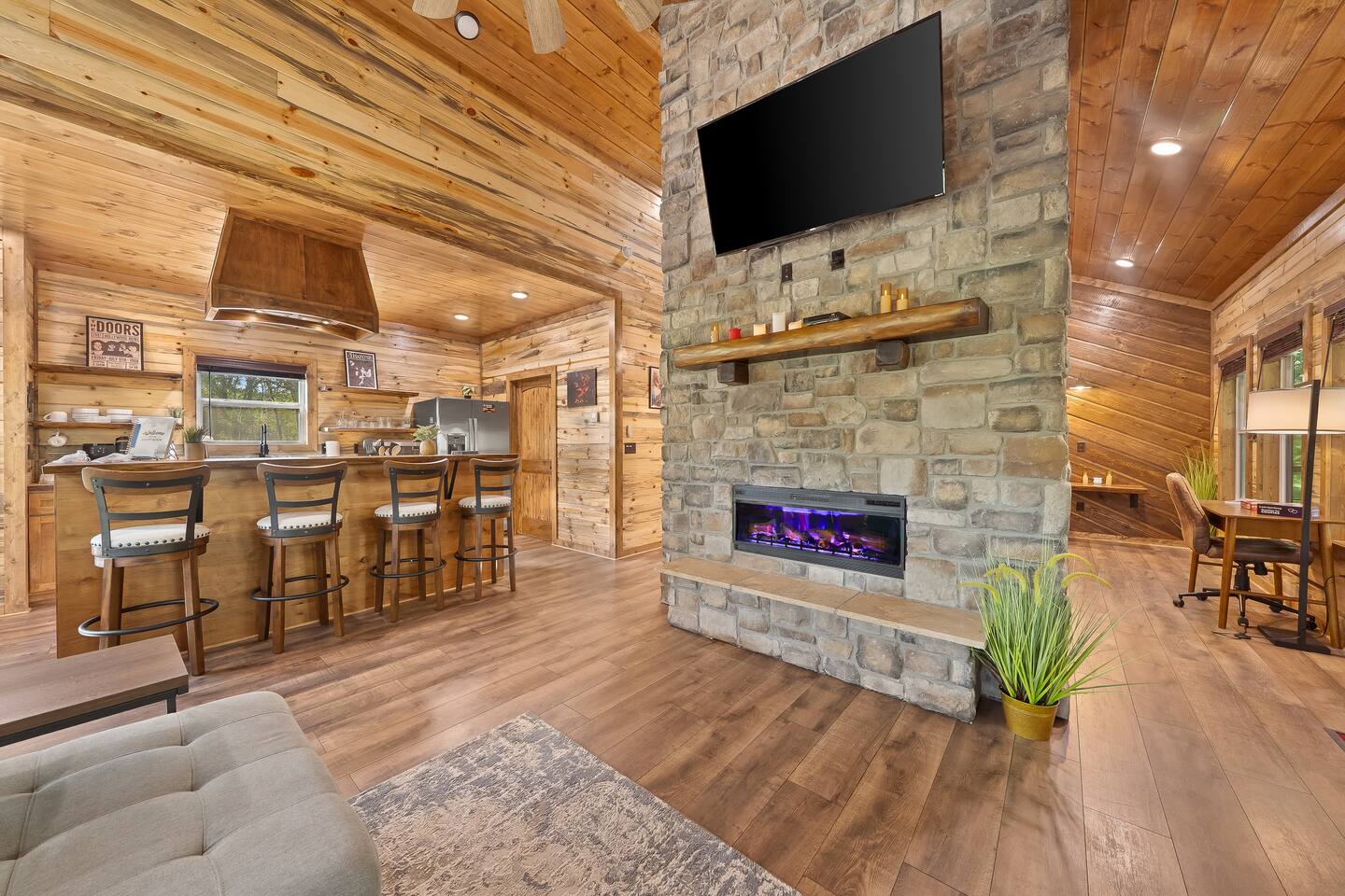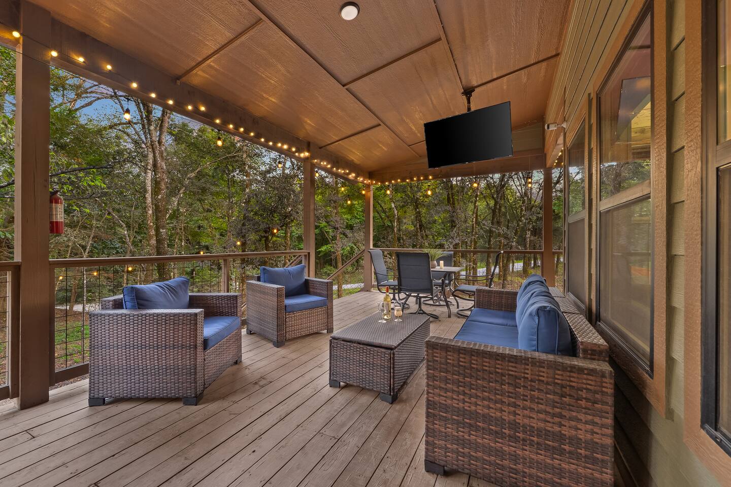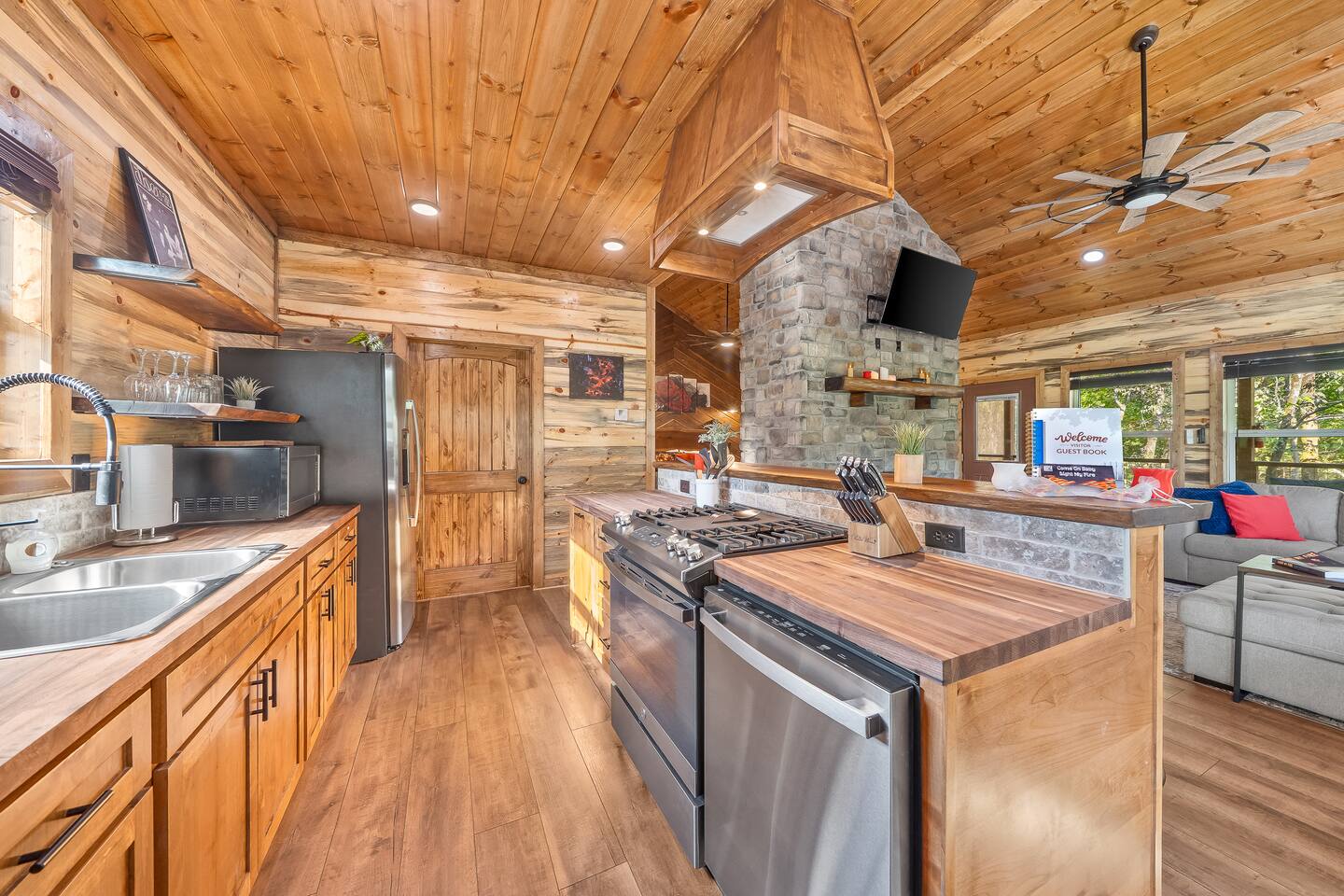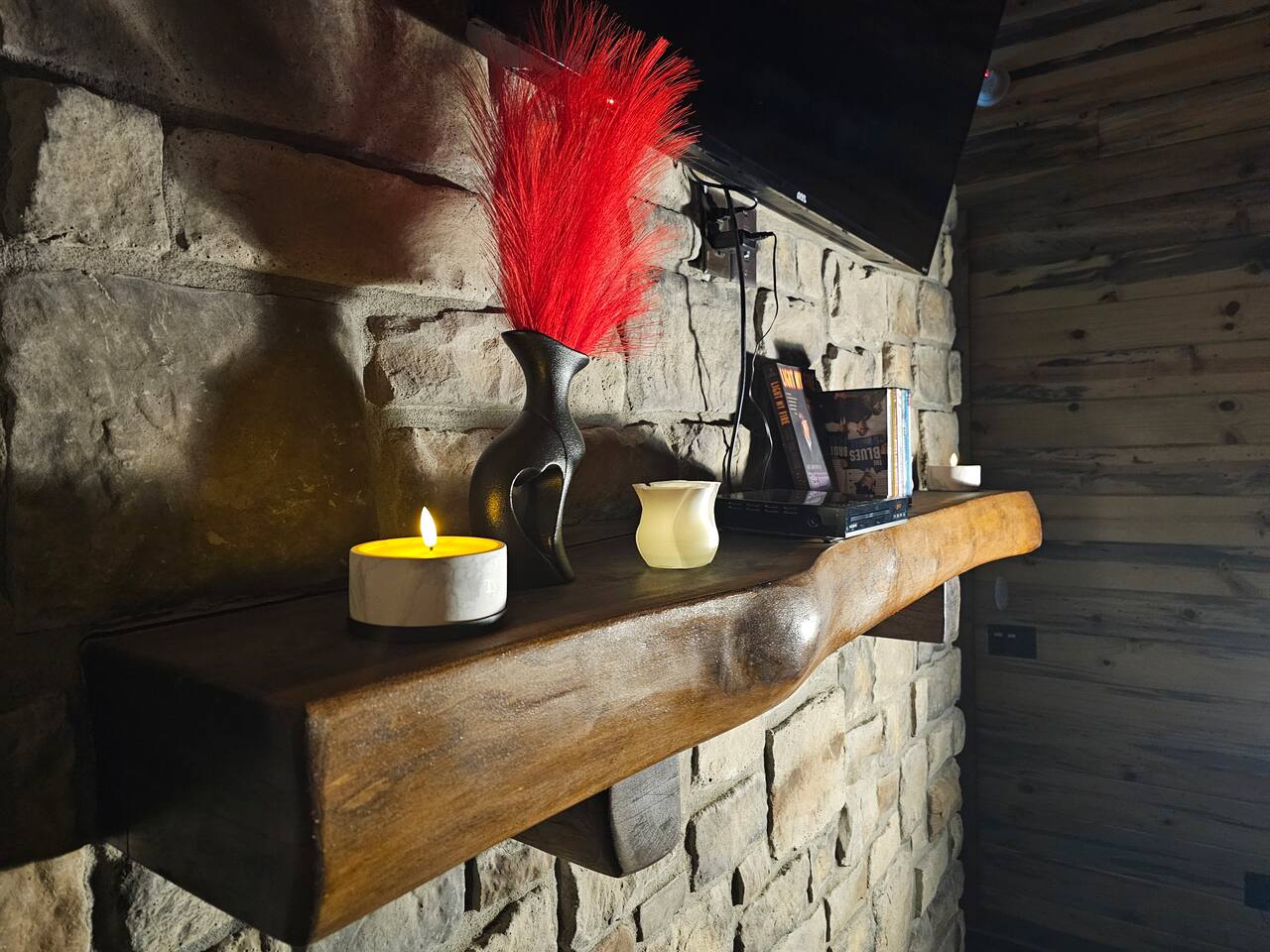 ⭑Primary Bedroom: Come On Baby Light My Fire⭑ ✔ Spacious and romantic ambiance, perfect for couples ✔ Luxurious bed linens, extra pillows, and blankets for ultimate comfort ✔ Clothing storage and hangers ✔ 65" Smart TV above the mantle ⭑Living Room:⭑ ✔ Cozy living space with a 65" Smart TV for your streaming pleasure ✔ Vent-free propane gas indoor fireplace for a warm, intimate setting ✔ 65" Smart TV above the mantle ⭑Kitchen & Dining Area:⭑ ✔ Fully equipped kitchen with stainless steel appliances: LP propane gas 5-burner cooktop range, fridge, microwave, and dishwasher (dishwasher pods provided) ✔ Cooking basics, dinnerware, and silverware included ✔ Keurig/coffee machine combo and wine glasses for a relaxing experience ✔ Grill accessories, utensils, and marshmallow/hot dog skewers located in kitchen drawer ⭑Bathrooms:⭑ ✔ Hotel-quality towels & linens, toilet paper, hand soap, and a starter kit of body wash, shampoo & conditioner ✔ Private toilet area ✔ Spacious walk-in shower with bench seat Laundry: ✔ Full-size stackable washer/dryer (washing pods provided) ⭑Outdoor Space:⭑ ✔ Private area with a fire pit ✔ Year-round hot tub spa for a soothing experience ✔ Outdoor hard piped BBQ grill (no need to bring propane) ✔Outdoor dining table with four chairs on the back porch ✔Outdoor patio set with sofa, 2 side chairs, and a coffee table ✔55" Smart TV on the porch ⭑Safety & Security:⭑ ✔ Exterior security cameras for peace of mind (no cameras face the hot tub) ✔ Smoke alarm, carbon monoxide alarm, and first aid kit provided ✔ Fire extinguishers located in the kitchen left of the sink and on patio right of grill ⭑Entertainment & Connectivity:⭑ ✔ High-speed Wi-Fi and dedicated workspace ✔ 3 Smart TVs ⭑Heating & Cooling:⭑ ✔ Central air conditioning and heating ✔ Ceiling fans for added comfort ⭑Parking & Accessibility:⭑ ✔ Free driveway parking for up to 4 vehicles ✔ Single-level home with no stairs — easy accessibility ✔ Several steps to the porch ✔ Boat parking available ⭑Services and Experiences⭑ ✔ NEW: Add-on services available - From a romantic dinner prepared by a private chef to a local in-cabin massage therapy ✔ Short distance from trails, wineries, and Hochatown's new Airbnb Experiences ✔ Schlage Encode Keypad Self check-in for convenience Your stay at Come On Baby Light My Fire promises unforgettable comfort, modern convenience, and an atmosphere designed to spark connection. This luxurious creek-side escape is sure to be one of our most popular retreats. Book now and let the flames of romance and cherished memories run wild at Come On Baby Light My Fire. Booking with Tree Frog Getaways means securing more than just a place to stay. You’re choosing a five-star experience managed by one of the top-performing management teams in the industry. Some of our cabins rank among the top 5% on Airbnb. All of our cabins are ranked among guest favorites that are celebrated for their thoughtful details, premium amenities, and spotless presentation. Availability is limited, so reserve your dates today.