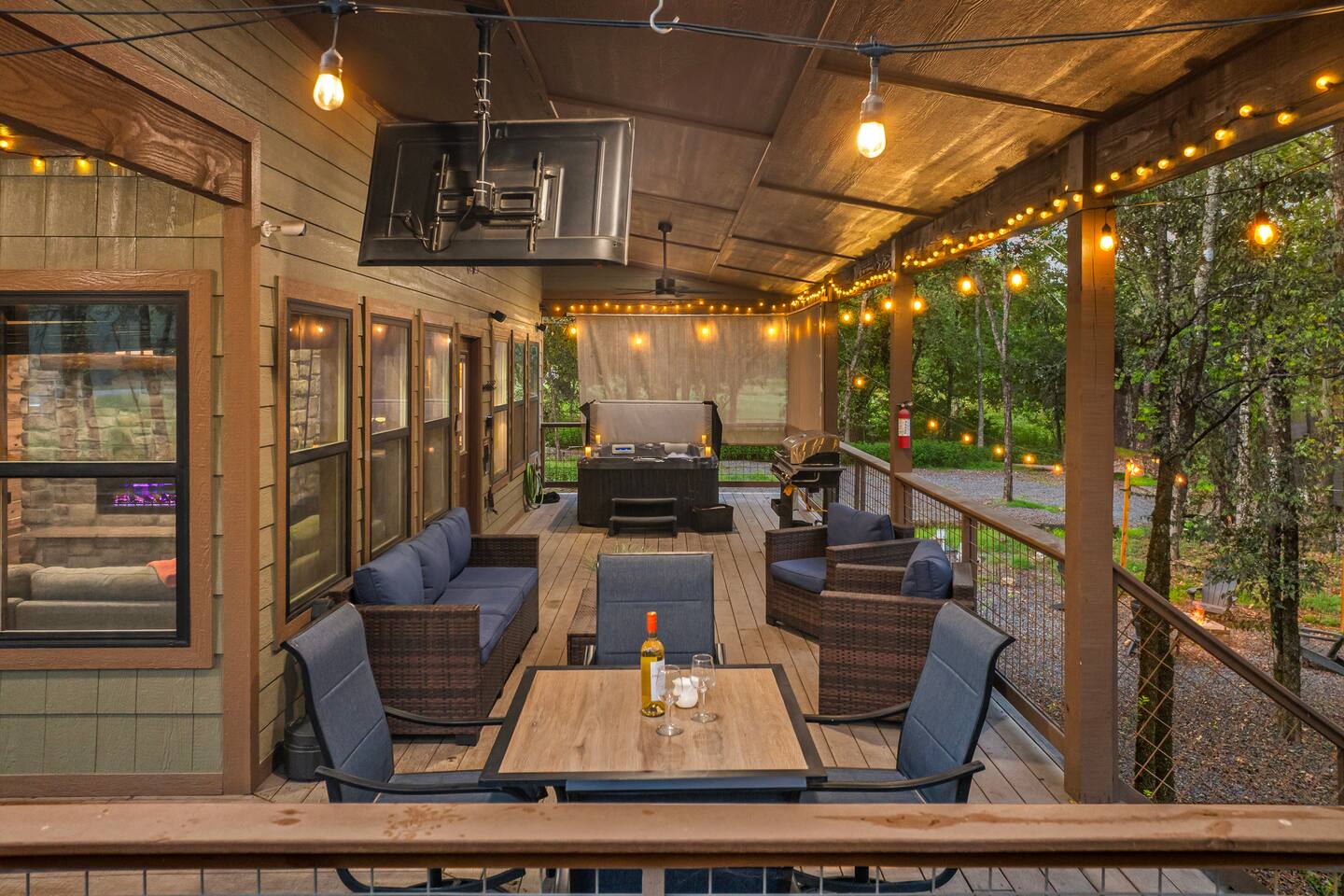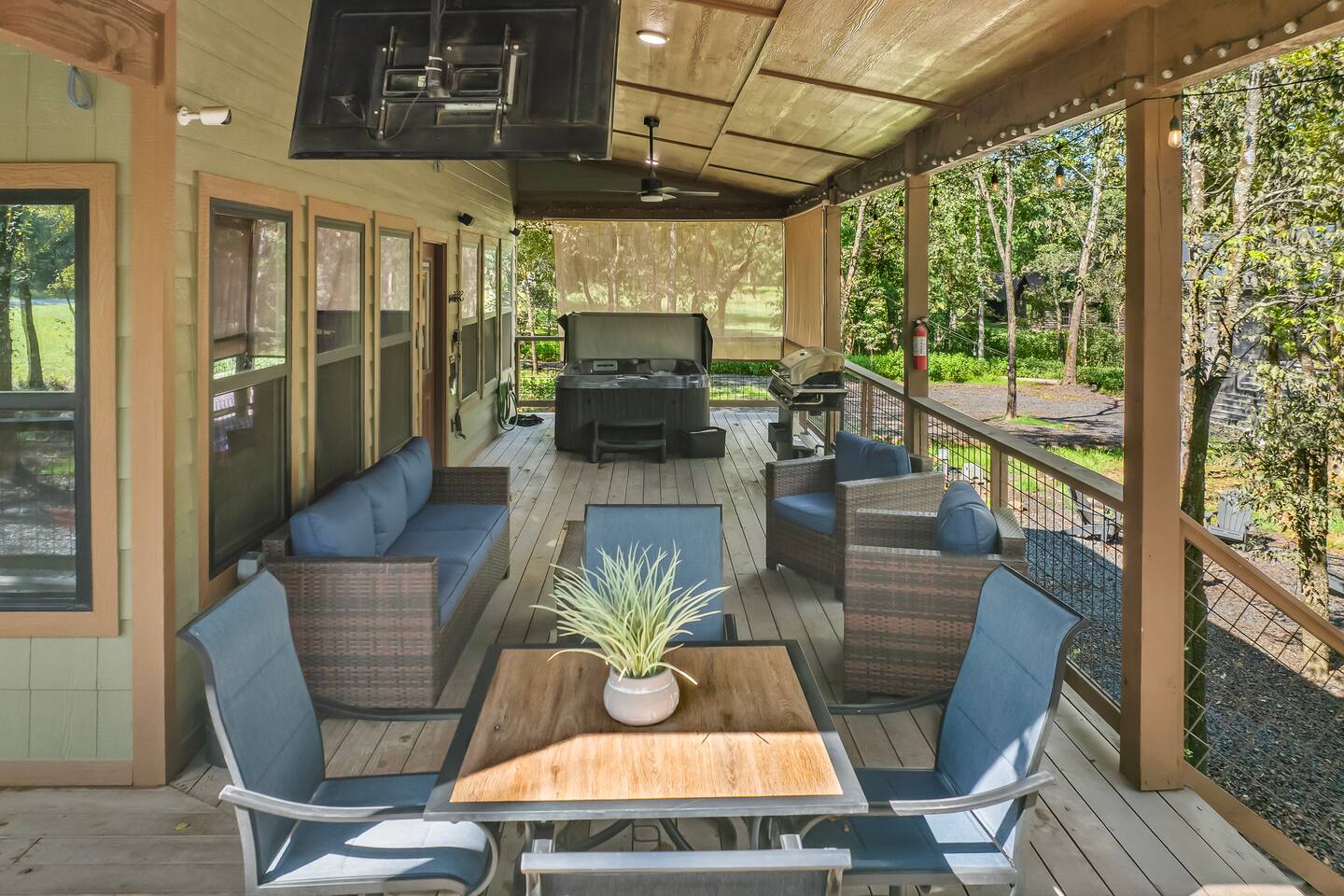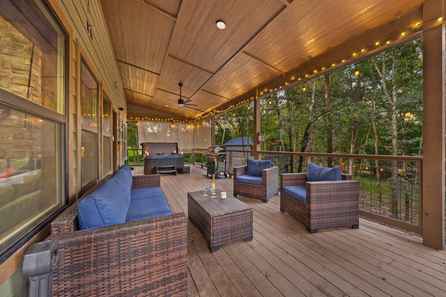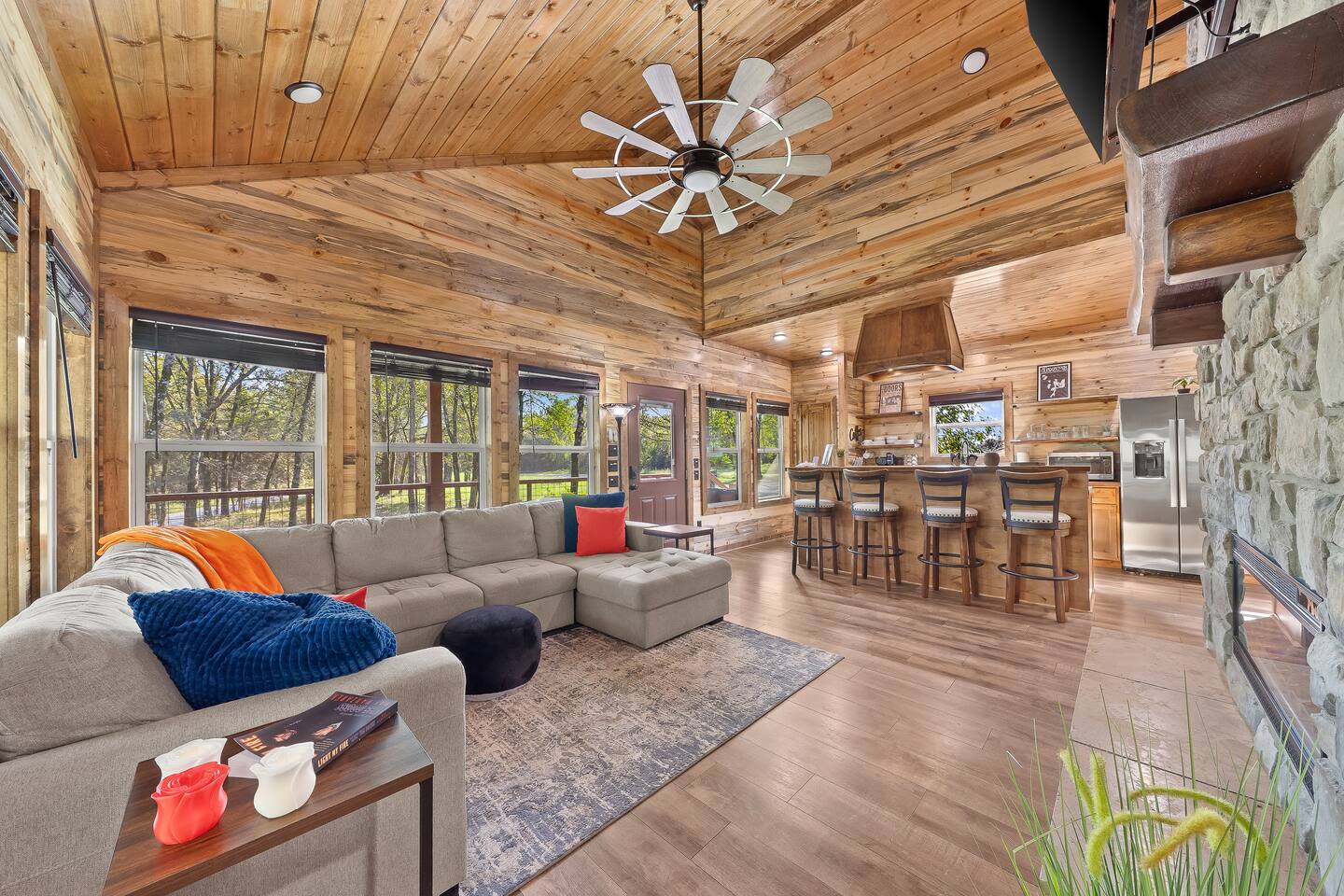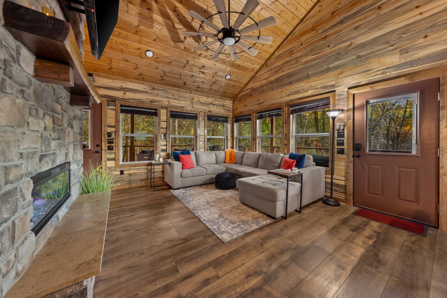 ⭑Primary Bedroom: Come On Baby Light My Fire⭑ ✔ Spacious and romantic ambiance, perfect for couples ✔ Luxurious bed linens, extra pillows, and blankets for ultimate comfort ✔ Clothing storage and hangers ✔ 65" Smart TV above the mantle ⭑Living Room:⭑ ✔ Cozy living space with a 65" Smart TV for your streaming pleasure ✔ Vent-free propane gas indoor fireplace for a warm, intimate setting ✔ 65" Smart TV above the mantle ⭑Kitchen & Dining Area:⭑ ✔ Fully equipped kitchen with stainless steel appliances: LP propane gas 5-burner cooktop range, fridge, microwave, and dishwasher (dishwasher pods provided) ✔ Cooking basics, dinnerware, and silverware included ✔ Keurig/coffee machine combo and wine glasses for a relaxing experience ✔ Grill accessories, utensils, and marshmallow/hot dog skewers located in kitchen drawer ⭑Bathrooms:⭑ ✔ Hotel-quality towels & linens, toilet paper, hand soap, and a starter kit of body wash, shampoo & conditioner ✔ Private toilet area ✔ Spacious walk-in shower with bench seat Laundry: ✔ Full-size stackable washer/dryer (washing pods provided) ⭑Outdoor Space:⭑ ✔ Private area with a fire pit ✔ Year-round hot tub spa for a soothing experience ✔ Outdoor hard piped BBQ grill (no need to bring propane) ✔Outdoor dining table with four chairs on the back porch ✔Outdoor patio set with sofa, 2 side chairs, and a coffee table ✔55" Smart TV on the porch ⭑Safety & Security:⭑ ✔ Exterior security cameras for peace of mind (no cameras face the hot tub) ✔ Smoke alarm, carbon monoxide alarm, and first aid kit provided ✔ Fire extinguishers located in the kitchen left of the sink and on patio right of grill ⭑Entertainment & Connectivity:⭑ ✔ High-speed Wi-Fi and dedicated workspace ✔ 3 Smart TVs ⭑Heating & Cooling:⭑ ✔ Central air conditioning and heating ✔ Ceiling fans for added comfort ⭑Parking & Accessibility:⭑ ✔ Free driveway parking for up to 4 vehicles ✔ Single-level home with no stairs — easy accessibility ✔ Several steps to the porch ✔ Boat parking available ⭑Services and Experiences⭑ ✔ NEW: Add-on services available - From a romantic dinner prepared by a private chef to a local in-cabin massage therapy ✔ Short distance from trails, wineries, and Hochatown's new Airbnb Experiences ✔ Schlage Encode Keypad Self check-in for convenience Your stay at Come On Baby Light My Fire promises unforgettable comfort, modern convenience, and an atmosphere designed to spark connection. This luxurious creek-side escape is sure to be one of our most popular retreats. Book now and let the flames of romance and cherished memories run wild at Come On Baby Light My Fire. Booking with Tree Frog Getaways means securing more than just a place to stay. You’re choosing a five-star experience managed by one of the top-performing management teams in the industry. Some of our cabins rank among the top 5% on Airbnb. All of our cabins are ranked among guest favorites that are celebrated for their thoughtful details, premium amenities, and spotless presentation. Availability is limited, so reserve your dates today.