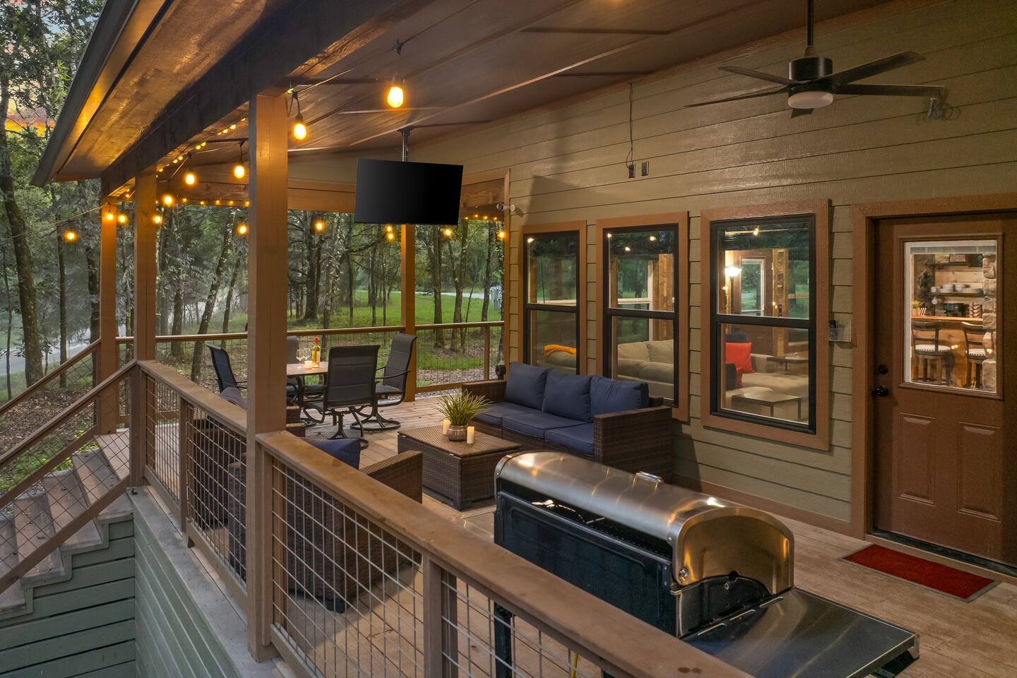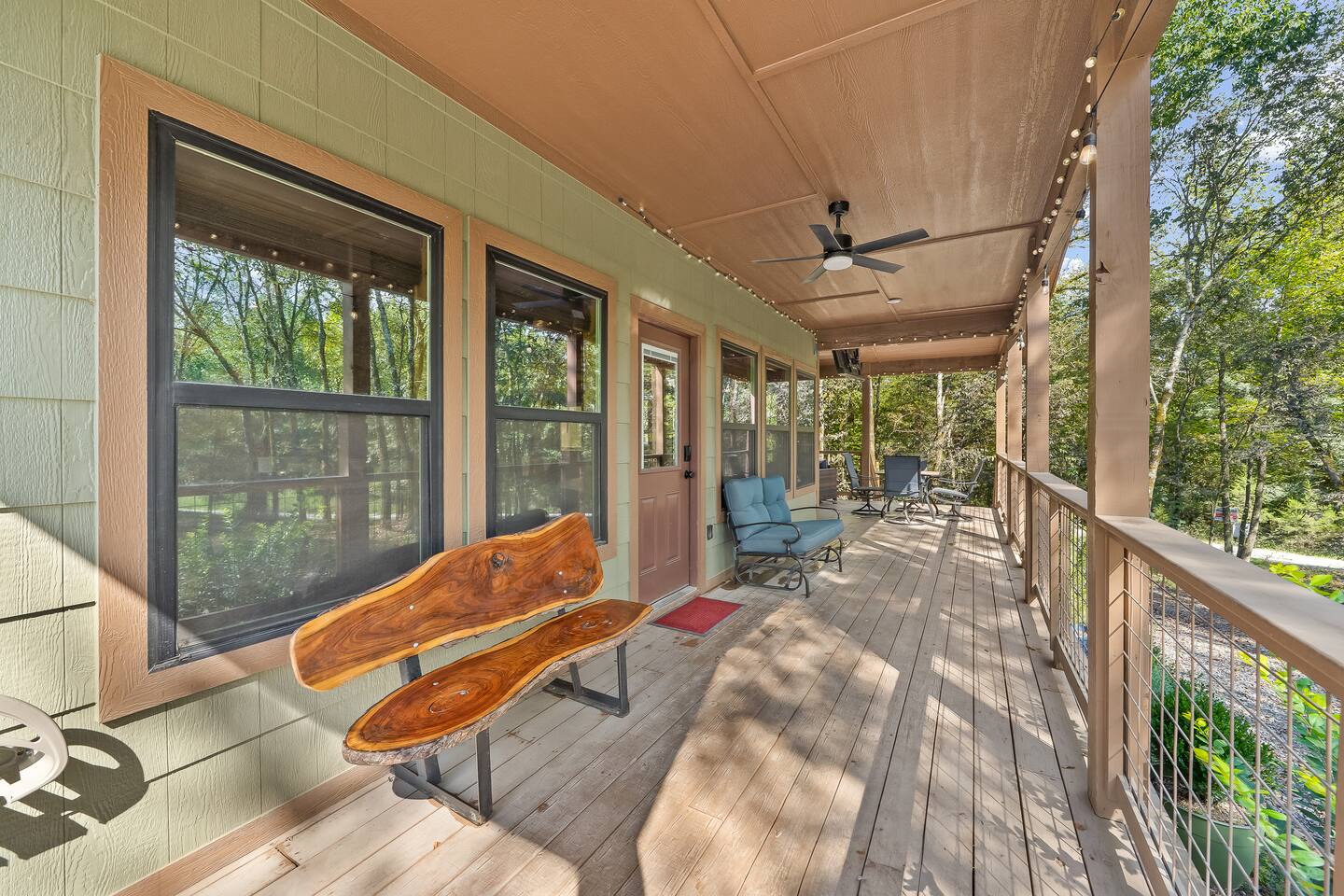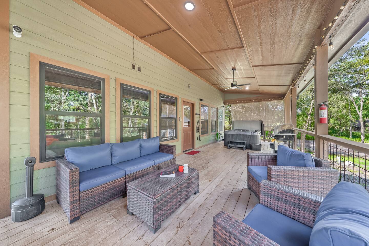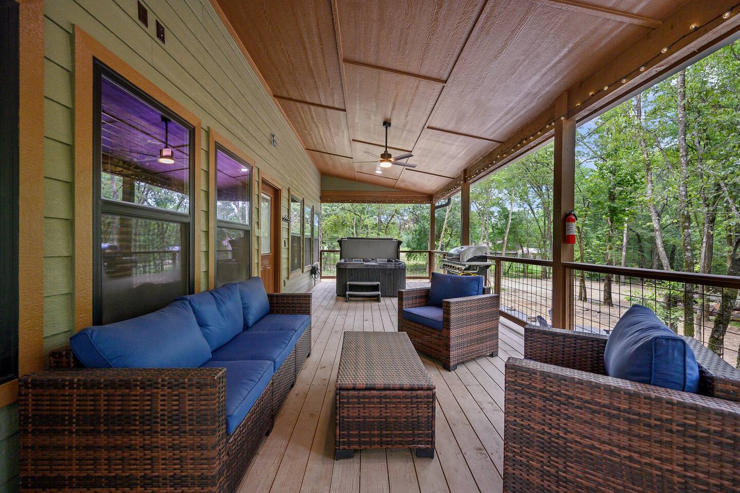 ⭑Primary Bedroom: Come On Baby Light My Fire⭑ ✔ Spacious and romantic ambiance, perfect for couples ✔ Luxurious bed linens, extra pillows, and blankets for ultimate comfort ✔ Clothing storage and hangers ✔ 65" Smart TV above the mantle ⭑Living Room:⭑ ✔ Cozy living space with a 65" Smart TV for your streaming pleasure ✔ Vent-free propane gas indoor fireplace for a warm, intimate setting ✔ 65" Smart TV above the mantle ⭑Kitchen & Dining Area:⭑ ✔ Fully equipped kitchen with stainless steel appliances: LP propane gas 5-burner cooktop range, fridge, microwave, and dishwasher (dishwasher pods provided) ✔ Cooking basics, dinnerware, and silverware included ✔ Keurig/coffee machine combo and wine glasses for a relaxing experience ✔ Grill accessories, utensils, and marshmallow/hot dog skewers located in kitchen drawer ⭑Bathrooms:⭑ ✔ Hotel-quality towels & linens, toilet paper, hand soap, and a starter kit of body wash, shampoo & conditioner ✔ Private toilet area ✔ Spacious walk-in shower with bench seat Laundry: ✔ Full-size stackable washer/dryer (washing pods provided) ⭑Outdoor Space:⭑ ✔ Private area with a fire pit ✔ Year-round hot tub spa for a soothing experience ✔ Outdoor hard piped BBQ grill (no need to bring propane) ✔Outdoor dining table with four chairs on the back porch ✔Outdoor patio set with sofa, 2 side chairs, and a coffee table ✔55" Smart TV on the porch ⭑Safety & Security:⭑ ✔ Exterior security cameras for peace of mind (no cameras face the hot tub) ✔ Smoke alarm, carbon monoxide alarm, and first aid kit provided ✔ Fire extinguishers located in the kitchen left of the sink and on patio right of grill ⭑Entertainment & Connectivity:⭑ ✔ High-speed Wi-Fi and dedicated workspace ✔ 3 Smart TVs ⭑Heating & Cooling:⭑ ✔ Central air conditioning and heating ✔ Ceiling fans for added comfort ⭑Parking & Accessibility:⭑ ✔ Free driveway parking for up to 4 vehicles ✔ Single-level home with no stairs — easy accessibility ✔ Several steps to the porch ✔ Boat parking available ⭑Services and Experiences⭑ ✔ NEW: Add-on services available - From a romantic dinner prepared by a private chef to a local in-cabin massage therapy ✔ Short distance from trails, wineries, and Hochatown's new Airbnb Experiences ✔ Schlage Encode Keypad Self check-in for convenience Your stay at Come On Baby Light My Fire promises unforgettable comfort, modern convenience, and an atmosphere designed to spark connection. This luxurious creek-side escape is sure to be one of our most popular retreats. Book now and let the flames of romance and cherished memories run wild at Come On Baby Light My Fire. Booking with Tree Frog Getaways means securing more than just a place to stay. You’re choosing a five-star experience managed by one of the top-performing management teams in the industry. Some of our cabins rank among the top 5% on Airbnb. All of our cabins are ranked among guest favorites that are celebrated for their thoughtful details, premium amenities, and spotless presentation. Availability is limited, so reserve your dates today.