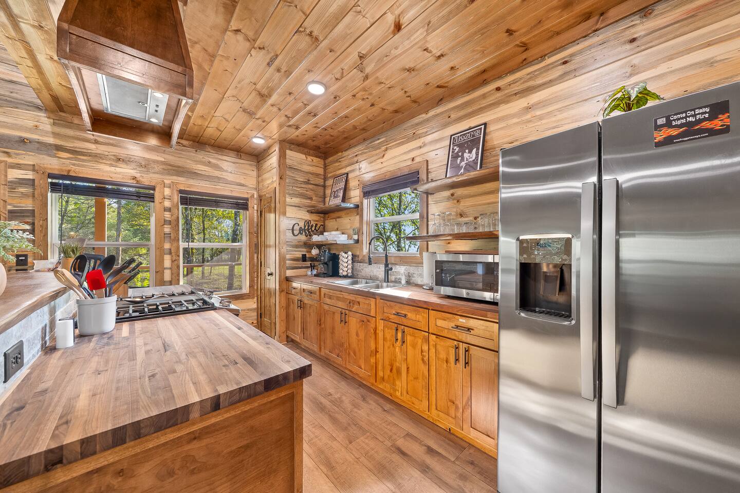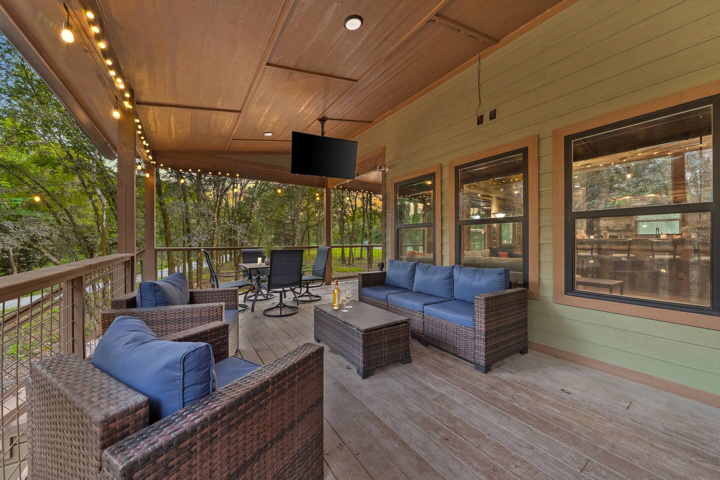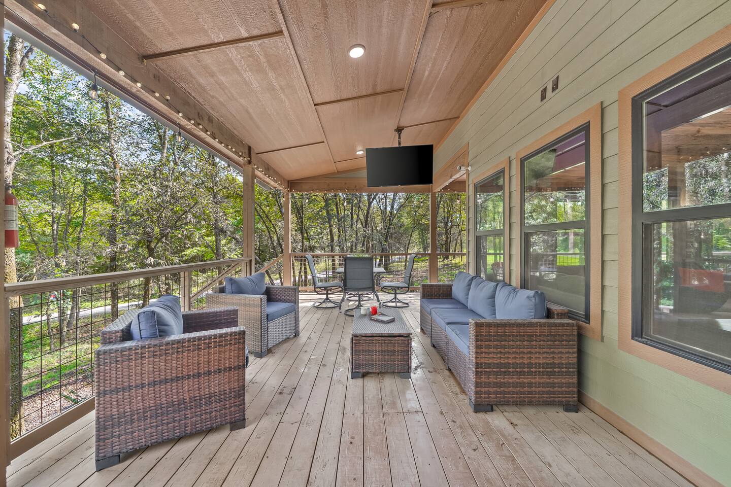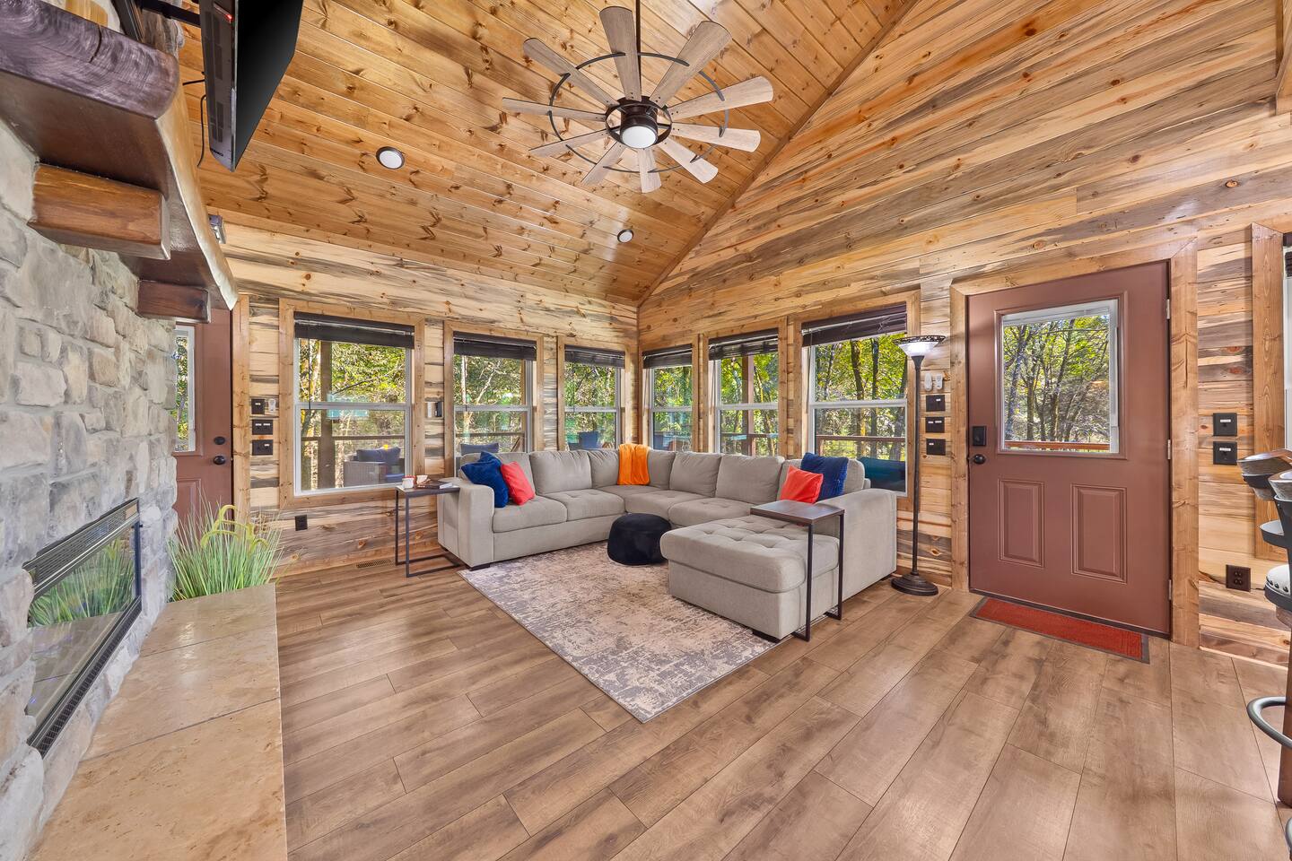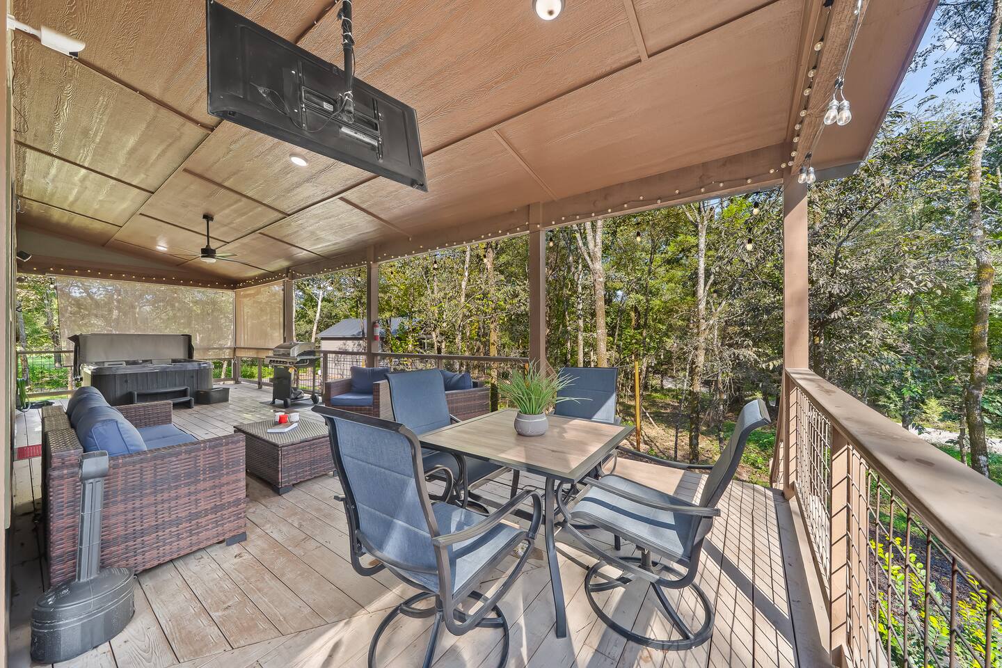 ⭑Primary Bedroom: Come On Baby Light My Fire⭑ ✔ Spacious and romantic ambiance, perfect for couples ✔ Luxurious bed linens, extra pillows, and blankets for ultimate comfort ✔ Clothing storage and hangers ✔ 65" Smart TV above the mantle ⭑Living Room:⭑ ✔ Cozy living space with a 65" Smart TV for your streaming pleasure ✔ Vent-free propane gas indoor fireplace for a warm, intimate setting ✔ 65" Smart TV above the mantle ⭑Kitchen & Dining Area:⭑ ✔ Fully equipped kitchen with stainless steel appliances: LP propane gas 5-burner cooktop range, fridge, microwave, and dishwasher (dishwasher pods provided) ✔ Cooking basics, dinnerware, and silverware included ✔ Keurig/coffee machine combo and wine glasses for a relaxing experience ✔ Grill accessories, utensils, and marshmallow/hot dog skewers located in kitchen drawer ⭑Bathrooms:⭑ ✔ Hotel-quality towels & linens, toilet paper, hand soap, and a starter kit of body wash, shampoo & conditioner ✔ Private toilet area ✔ Spacious walk-in shower with bench seat Laundry: ✔ Full-size stackable washer/dryer (washing pods provided) ⭑Outdoor Space:⭑ ✔ Private area with a fire pit ✔ Year-round hot tub spa for a soothing experience ✔ Outdoor hard piped BBQ grill (no need to bring propane) ✔Outdoor dining table with four chairs on the back porch ✔Outdoor patio set with sofa, 2 side chairs, and a coffee table ✔55" Smart TV on the porch ⭑Safety & Security:⭑ ✔ Exterior security cameras for peace of mind (no cameras face the hot tub) ✔ Smoke alarm, carbon monoxide alarm, and first aid kit provided ✔ Fire extinguishers located in the kitchen left of the sink and on patio right of grill ⭑Entertainment & Connectivity:⭑ ✔ High-speed Wi-Fi and dedicated workspace ✔ 3 Smart TVs ⭑Heating & Cooling:⭑ ✔ Central air conditioning and heating ✔ Ceiling fans for added comfort ⭑Parking & Accessibility:⭑ ✔ Free driveway parking for up to 4 vehicles ✔ Single-level home with no stairs — easy accessibility ✔ Several steps to the porch ✔ Boat parking available ⭑Services and Experiences⭑ ✔ NEW: Add-on services available - From a romantic dinner prepared by a private chef to a local in-cabin massage therapy ✔ Short distance from trails, wineries, and Hochatown's new Airbnb Experiences ✔ Schlage Encode Keypad Self check-in for convenience Your stay at Come On Baby Light My Fire promises unforgettable comfort, modern convenience, and an atmosphere designed to spark connection. This luxurious creek-side escape is sure to be one of our most popular retreats. Book now and let the flames of romance and cherished memories run wild at Come On Baby Light My Fire. Booking with Tree Frog Getaways means securing more than just a place to stay. You’re choosing a five-star experience managed by one of the top-performing management teams in the industry. Some of our cabins rank among the top 5% on Airbnb. All of our cabins are ranked among guest favorites that are celebrated for their thoughtful details, premium amenities, and spotless presentation. Availability is limited, so reserve your dates today.