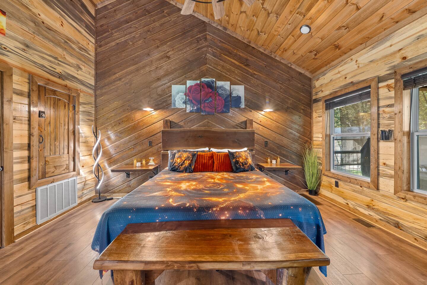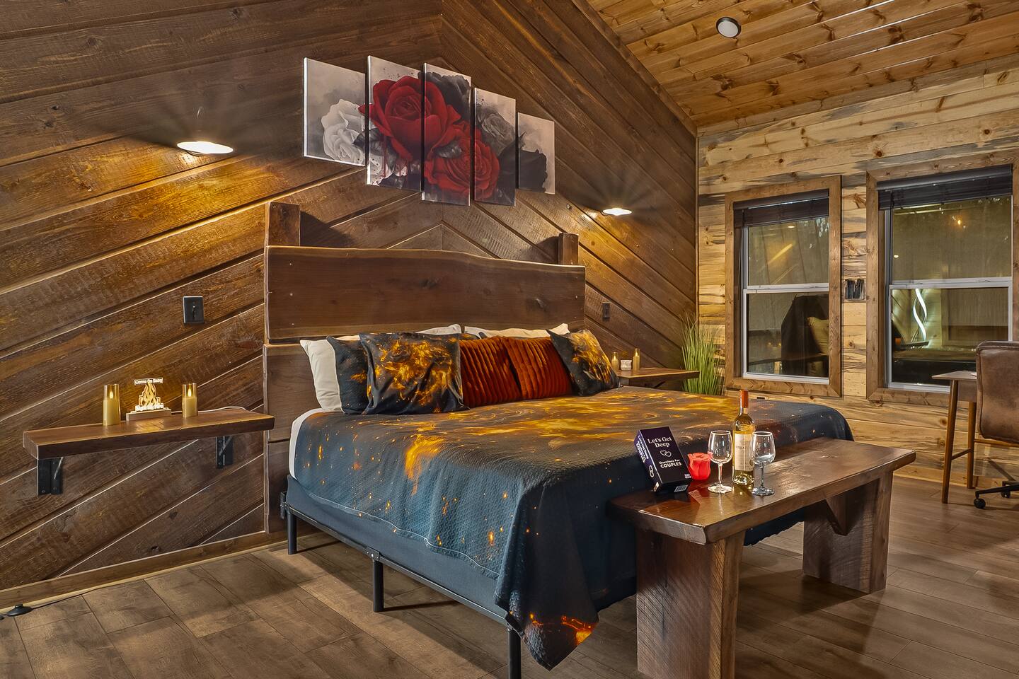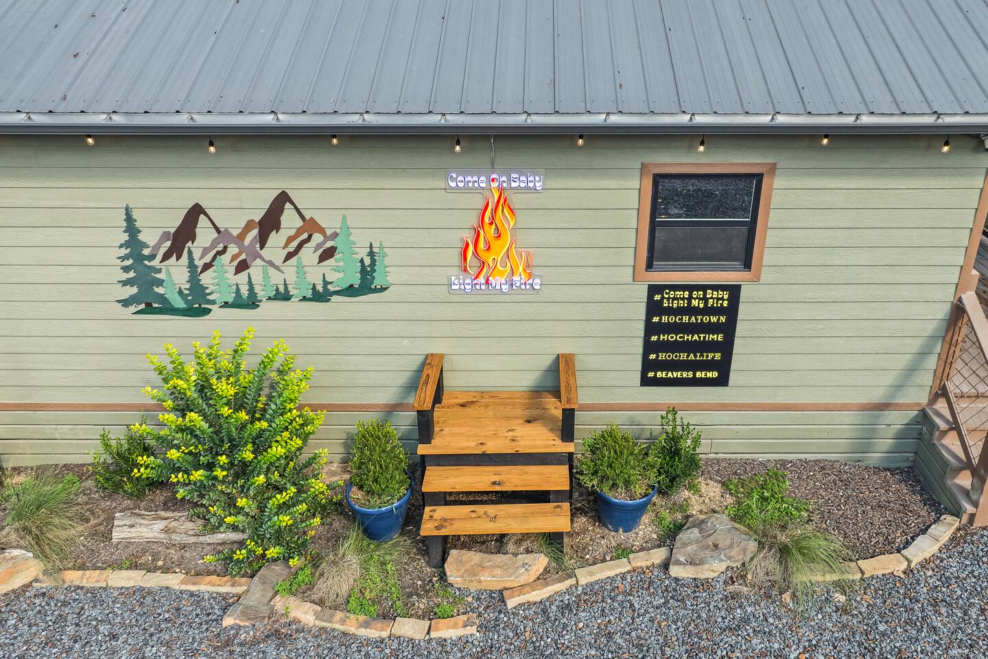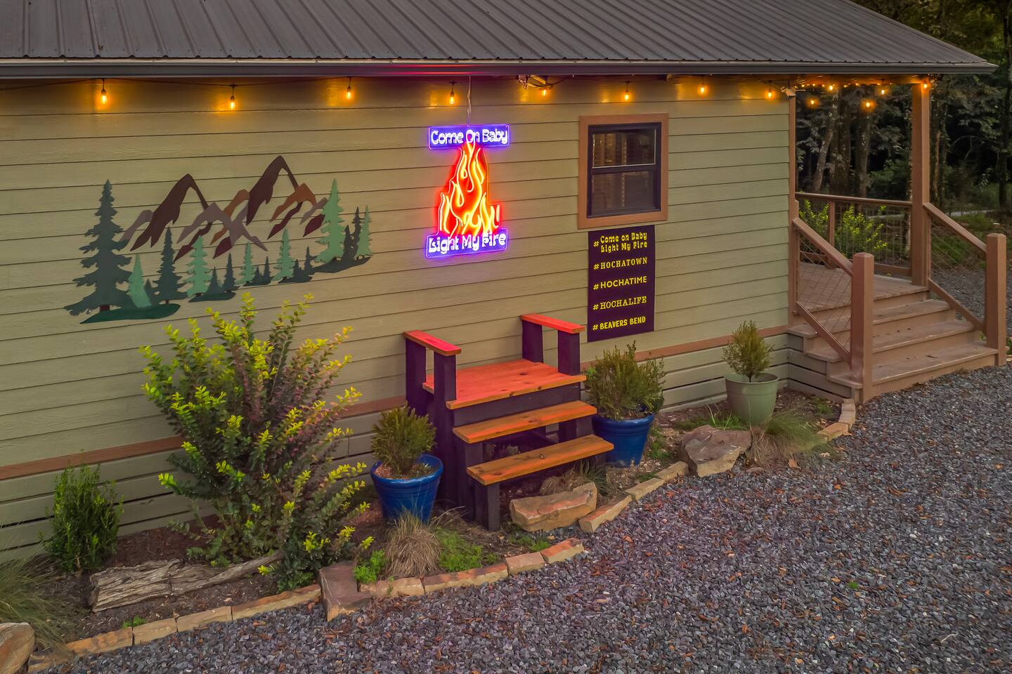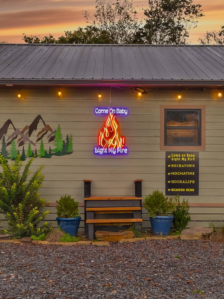 Escape to COME ON BABY LIGHT MY FIRE, a cozy one-bedroom cabin on the edge of the old Camp Family Ranch in Hochatown, OK. Enjoy cathedral ceilings, a double-sided fireplace, copper vanities, and a private hot tub. Relax on the covered deck, cozy up or stargaze by the fire pit. Three minutes from Choctaw Landing Casino and Grateful Head Pizza Oven & Tap Room, this charming retreat blends rustic elegance with modern comfort. It's perfect for couples or honeymooners seeking a romantic getaway.