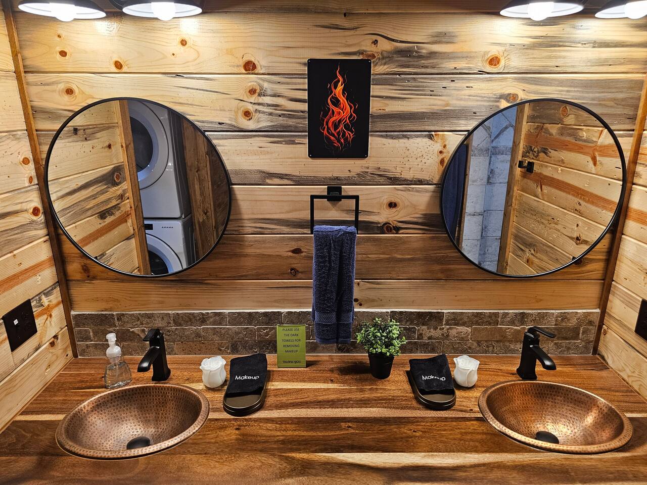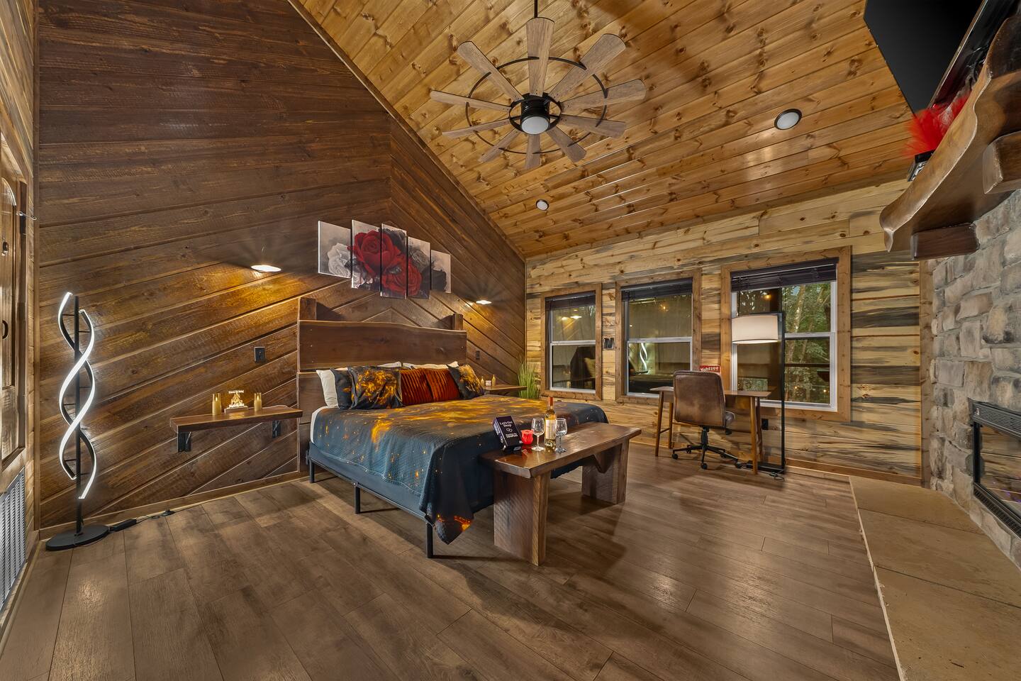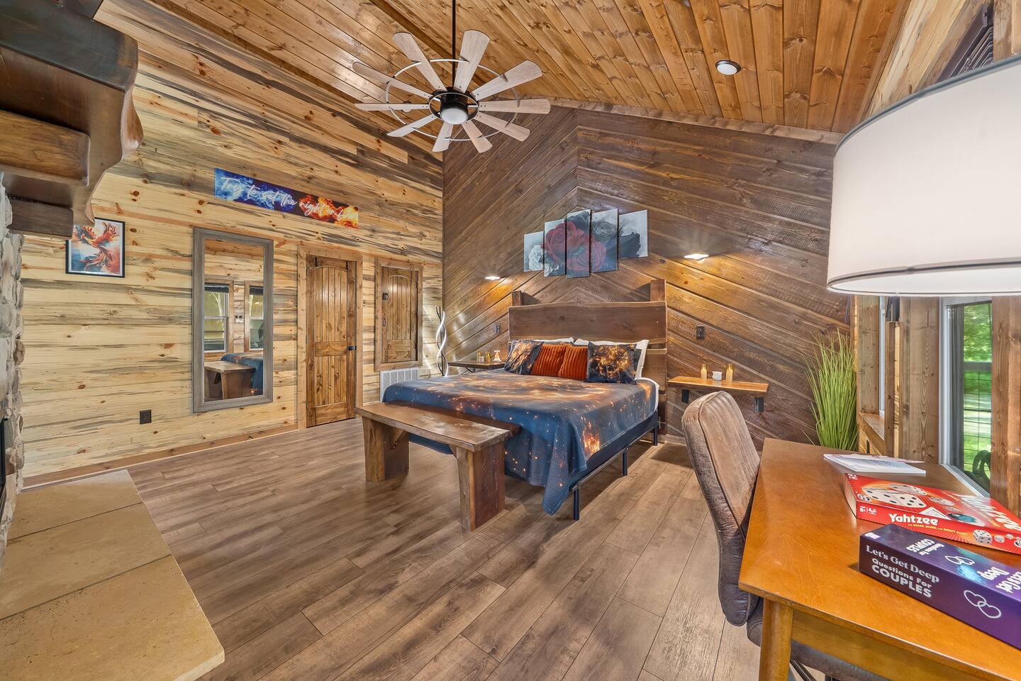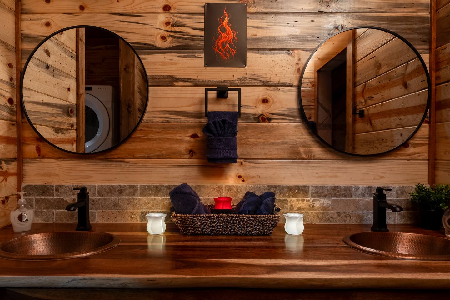 Escape to COME ON BABY LIGHT MY FIRE, a cozy one-bedroom cabin on the edge of the old Camp Family Ranch in Hochatown, OK. Enjoy cathedral ceilings, a double-sided fireplace, copper vanities, and a private hot tub. Relax on the covered deck, cozy up or stargaze by the fire pit. Three minutes from Choctaw Landing Casino and Grateful Head Pizza Oven & Tap Room, this charming retreat blends rustic elegance with modern comfort. It's perfect for couples or honeymooners seeking a romantic getaway.