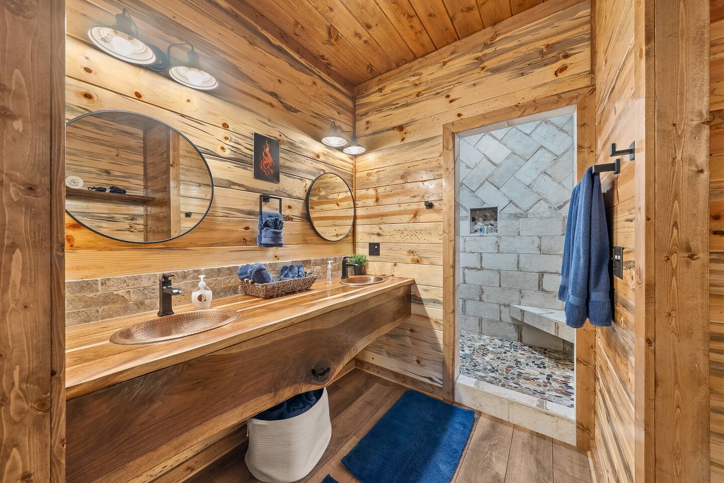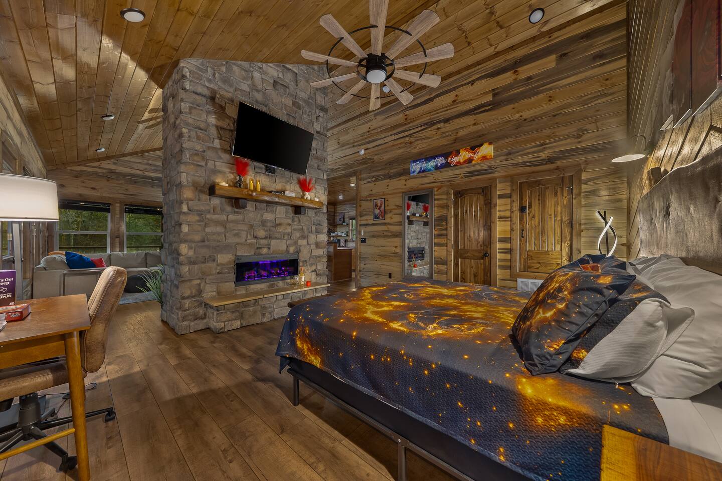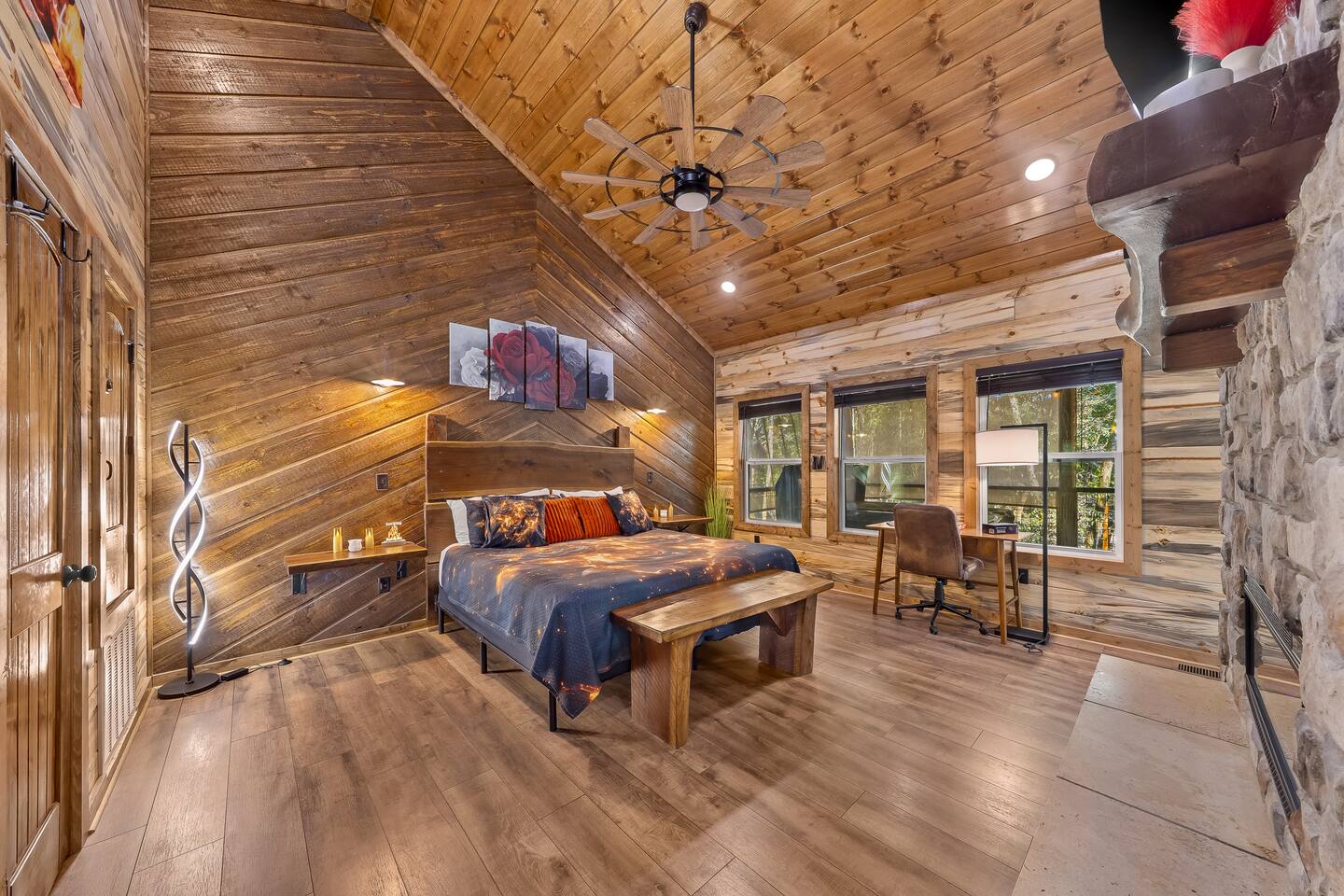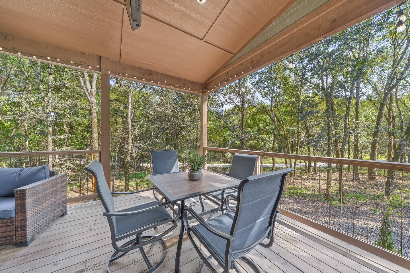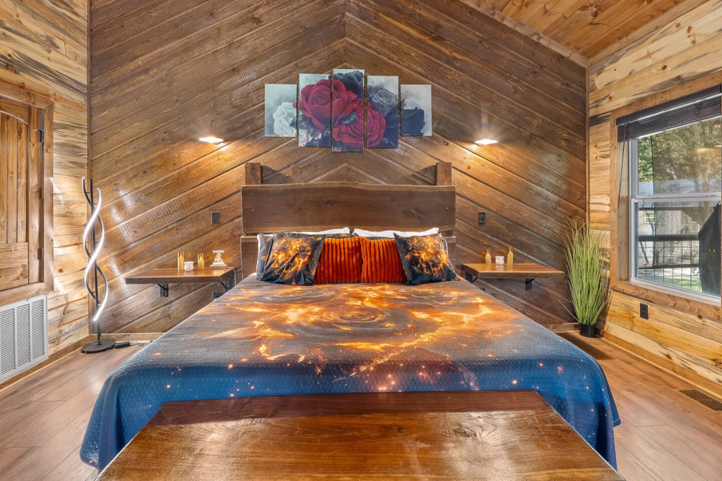 Escape to COME ON BABY LIGHT MY FIRE, a cozy one-bedroom cabin on the edge of the old Camp Family Ranch in Hochatown, OK. Enjoy cathedral ceilings, a double-sided fireplace, copper vanities, and a private hot tub. Relax on the covered deck, cozy up or stargaze by the fire pit. Three minutes from Choctaw Landing Casino and Grateful Head Pizza Oven & Tap Room, this charming retreat blends rustic elegance with modern comfort. It's perfect for couples or honeymooners seeking a romantic getaway.