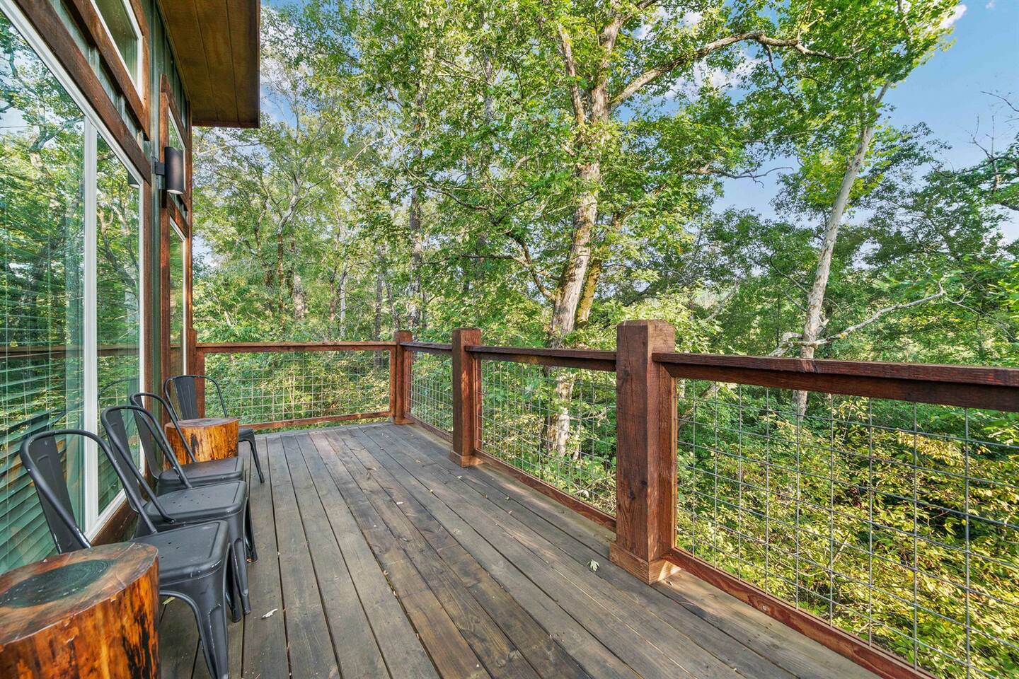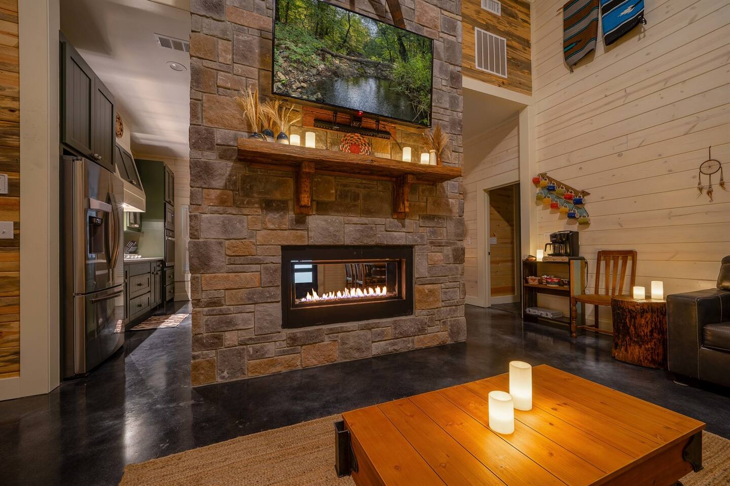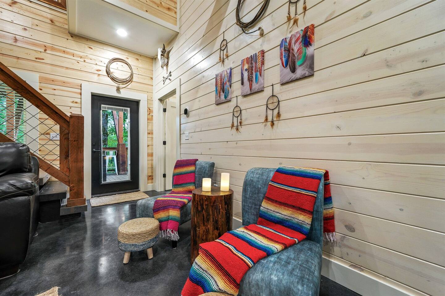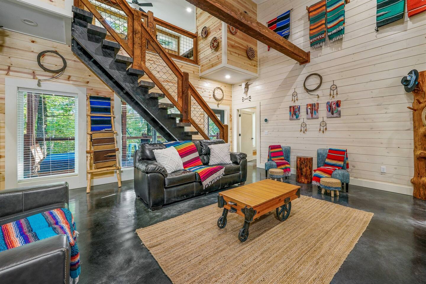 Getting to the Navajo Rug cabin is part of the adventure! You travel from Hwy 259 down cress road. We recommend bringing a vehicle like a pickup or an SUV that has at least 7" clearance, definitely not low to the ground. Be sure to find the directions to the cabin in our Guest Experience Hub in your message portal. Navajo Rug - Sleeps 10 Guests and 2 Dogs < 50 lbs. ⭑Primary Bedroom 1:⭑ Sleeps 2 * Private Room/ Spacious King Bed / Romantic Ambiance, Private Ensuite * Luxurious bed linens, extra pillows, and blankets for ultimate comfort * Clothing storage and hangers ⭑Primary Bedroom 2:⭑ Sleeps 2 * Private Room/ Spacious King Bed / Romantic Ambiance, Private Ensuite * Luxurious bed linens, extra pillows, and blankets for ultimate comfort * Clothing storage and hangers ⭑Living Room:⭑ Sleeps 2 * Full-size Sofa Sleeper * Cozy living space with a 65-inch HDTV stream your favorite service * See-thru Natural Gas indoor Fireplace for a warm, intimate setting *Loft* Sleeps 4 * Two queen-sized Murphy Beds * Pack-n-Play portable crib * Board Games/ Foosball * Balcony overlooking the creek ⭑Kitchen and Dining Area:⭑ * Fully equipped kitchen with a Samsung gas Cooktop and fridge, built-in wall oven, built-in wall microwave, and dishwasher * Combo Keurig/ Carafe Coffee Machine, Mugs & Wine Glasses * Extensive Cookware, Dinnerware and Utensils to serve up to 10 people and more ⭑Common Bathroom/ Laundry:⭑ * Spacious bathroom with a bathtub * Full-size front-loading stackable Washer / Dryer * Essentials like towels, bed sheets, soap, and toilet paper provided ⭑Outdoor Space:⭑ * Private patio Fire pit and outdoor furniture * Hot tub spa available all year for a soothing experience * Outdoor Kitchen and BBQ Grill and Dining Table/ Serving Bar overlooking the creek * Custom Playground built from logs harvested on the property * Circle Drive w/ Portico (drive-thru carport) ⭑Additional Amenities:⭑ * Board games and family-friendly items like a pack-n-play ⭑Safety and Security:⭑ * Exterior security cameras for peace of mind * Smoke alarm, carbon monoxide alarm, and first aid kit provided, Grease Fire Blanket and fire Extinguishers at Kitchen and Outdoor Grill ⭑Entertainment and Connectivity:⭑ * High-speed WiFi and dedicated workspace ⭑Heating and Cooling:⭑ * Central air conditioning and heating * Ceiling fans in all living spaces for additional comfort ⭑Parking and Facilities:⭑ * Free driveway parking on premises for up to 6 vehicles * Two-level home with stairs accessing the gaming loft ⭑Services and Experiences⭑ * NEW: Add-on services available - From a romantic dinner prepared by a private chef to a local in-cabin massage therapy * Short distance from trails, wineries, and Hochatown's new Airbnb Experiences * Schlage Encode Keypad Self check-in for convenience Your stay at The Navajo Rug Cabin promises unforgettable Luxury, modern convenience, and fun for all ages rain or shine. Book now and let the memories begin! Booking with Tree Frog Getaways means securing more than just a place to stay. You’re choosing a five-star experience managed by one of the top-performing management teams in the industry. Some of our cabins rank among the top 5% on Airbnb. All of our cabins are ranked among guest favorites that are celebrated for their thoughtful details, premium amenities, and spotless presentation. Availability is limited, so reserve your dates today.