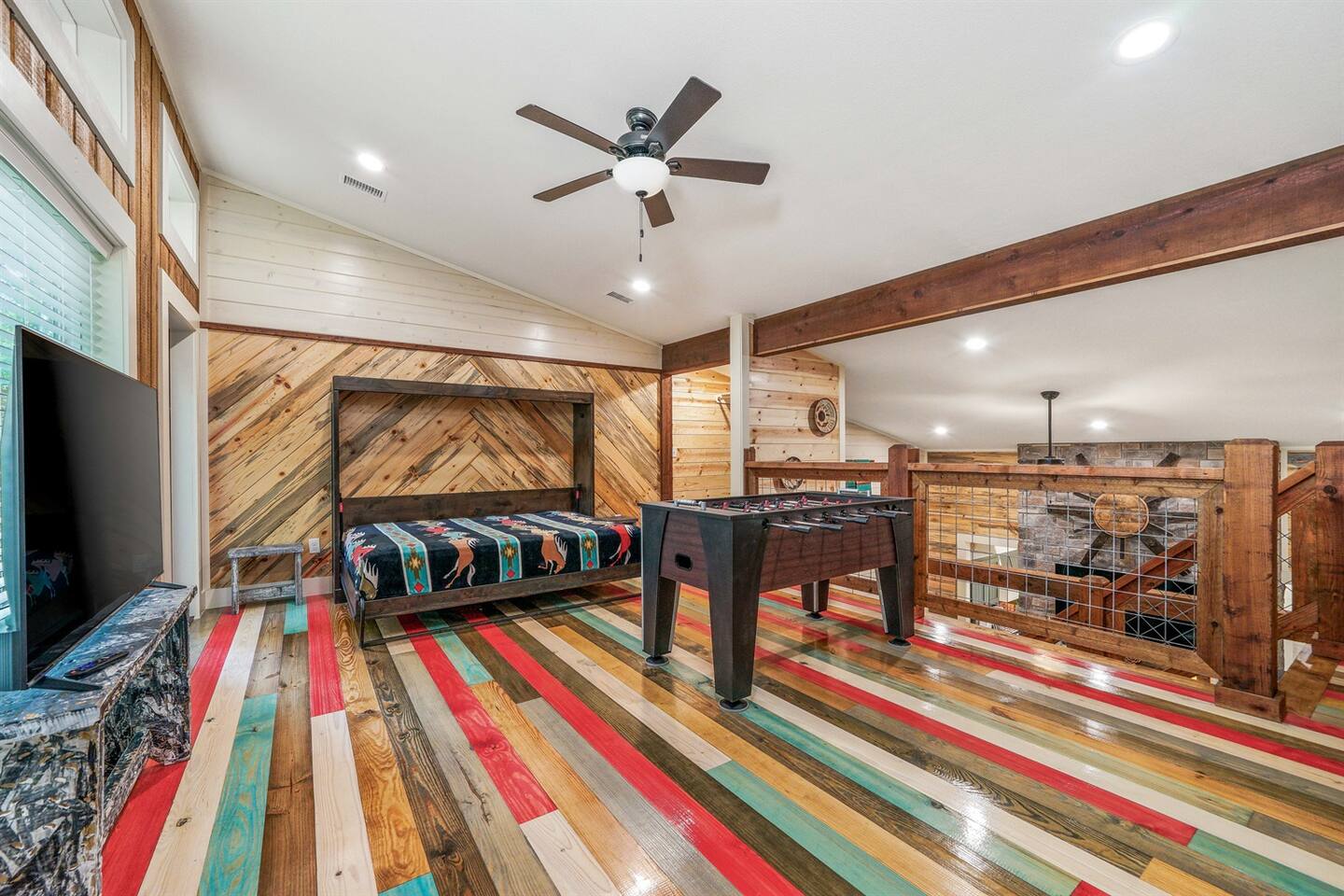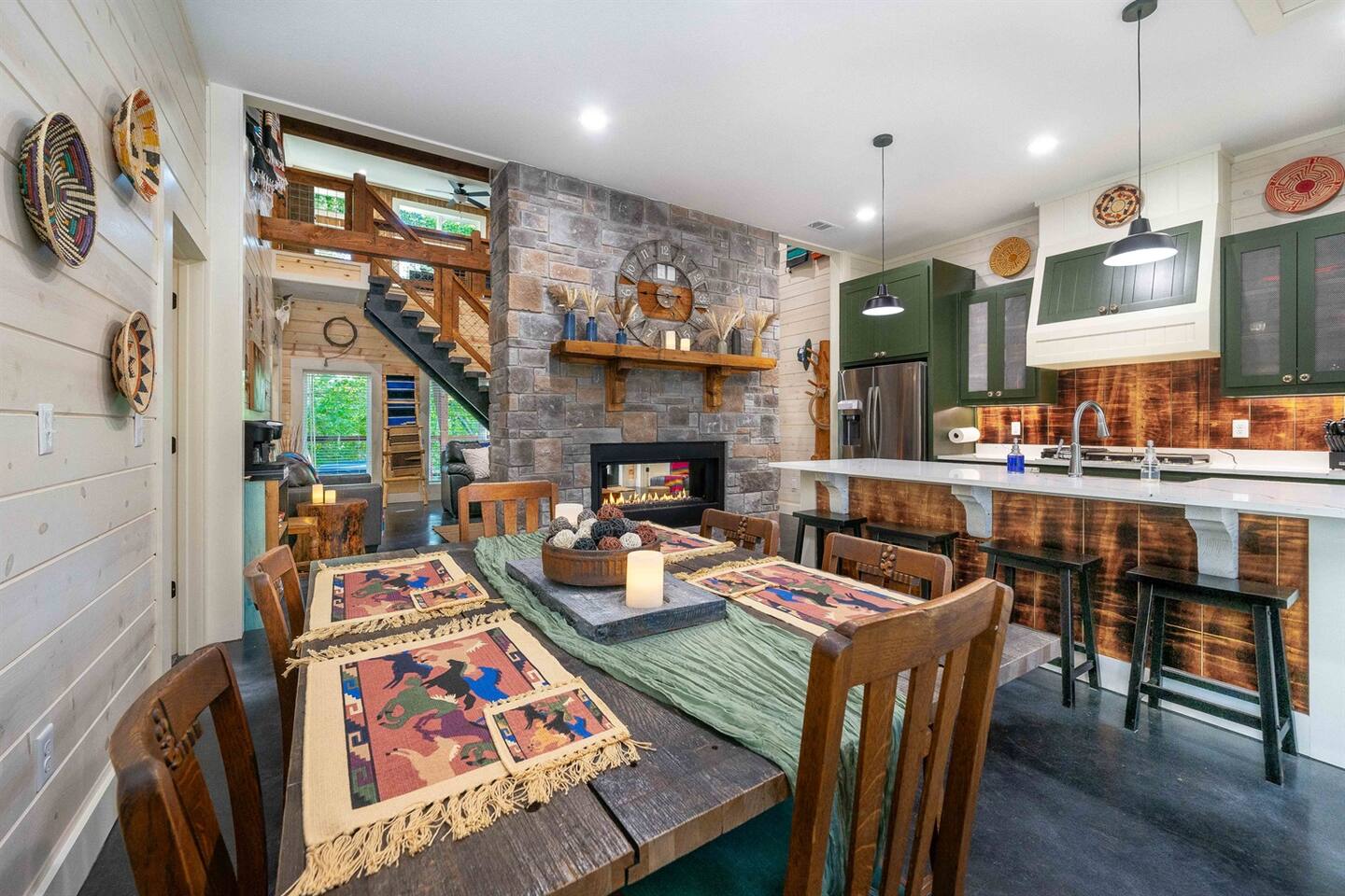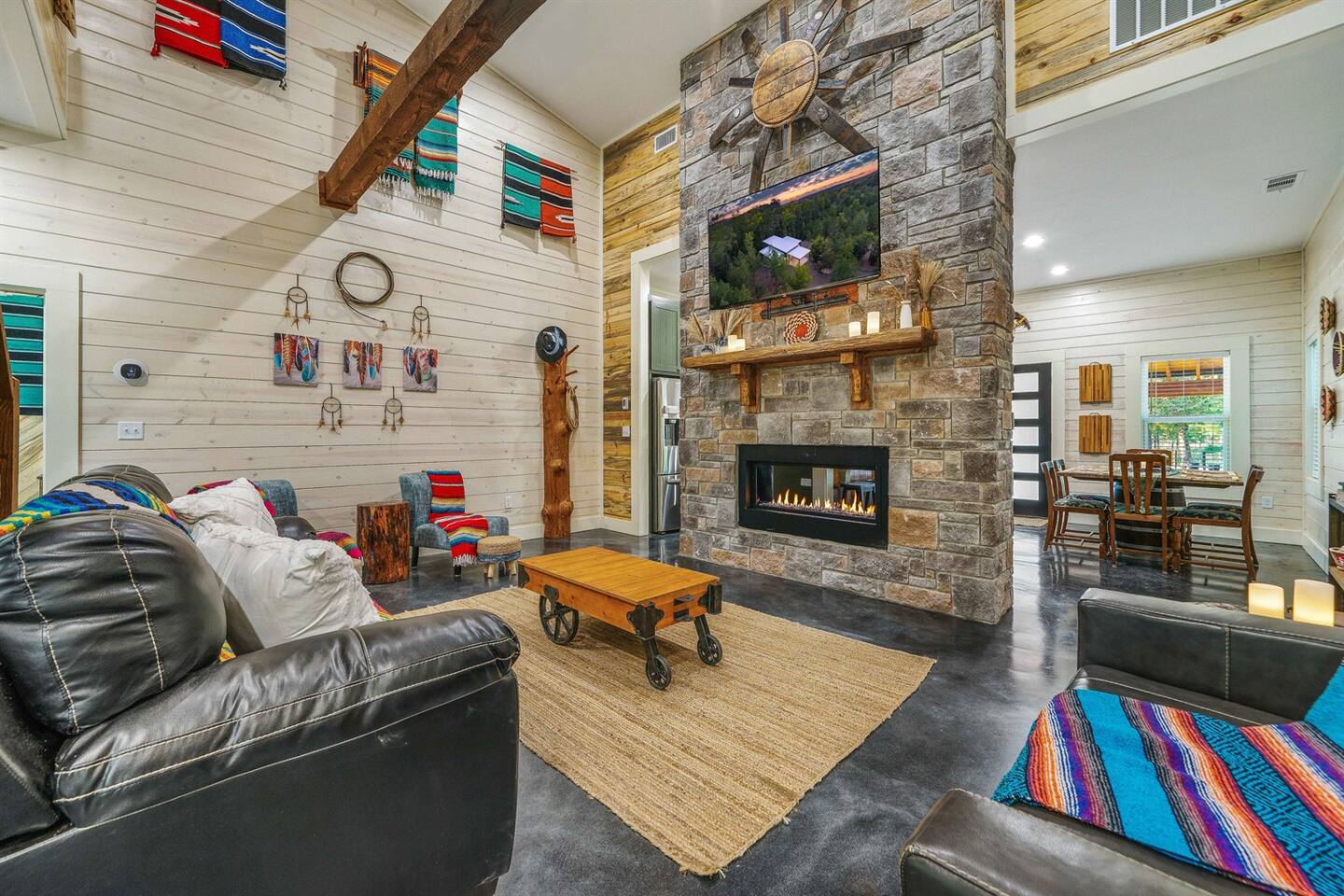 NAVAJO RUG is the perfect family & friends getaway! Built on a bluff above a clear spring-fed creek the cabin accommodates up to 10 guests offering two primary bedrooms, three full baths, and a spacious gaming loft. Explore the many trails & back roads on your ATVs/ Mountain Bikes or Walk/ Hike the gorgeous outdoors. There is something for everyone here, rain or shine. Book your stay today and immerse yourself in the tranquility of our hideaway. Fun and adventure await you at The Navajo Rug!